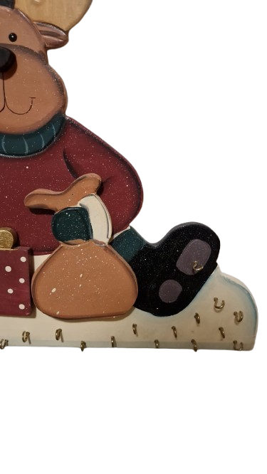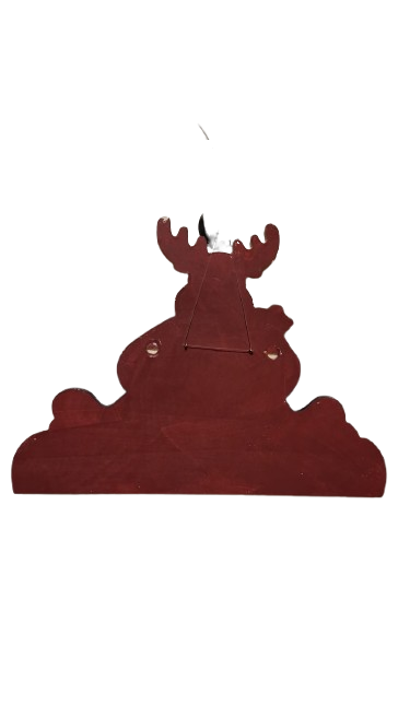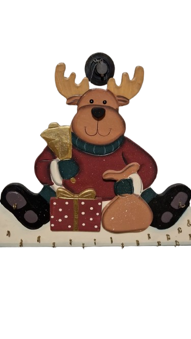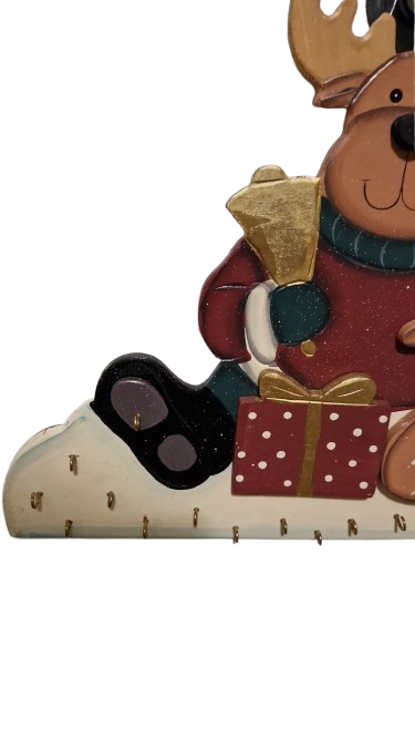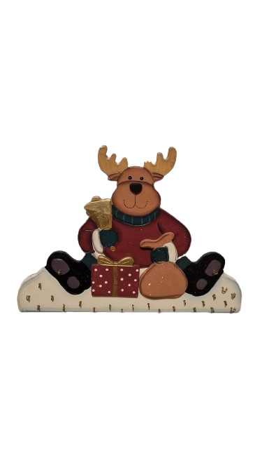 Dřevěný adventní kalendář ve tvaru soba který drží zvonek a sedí vedle dárečku.