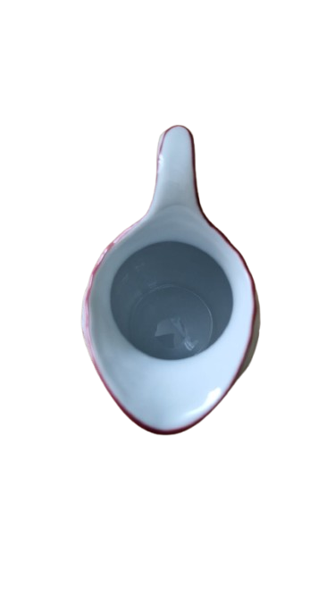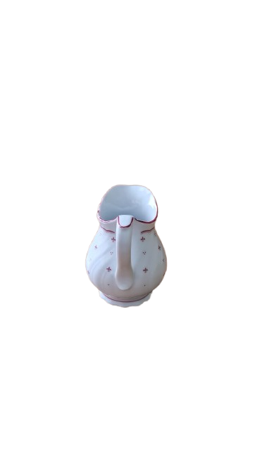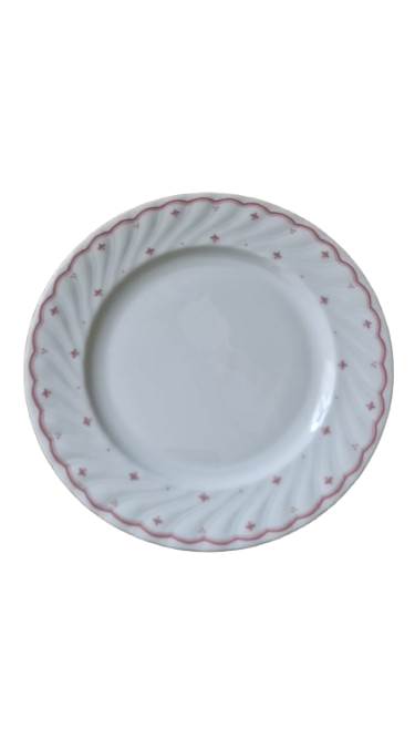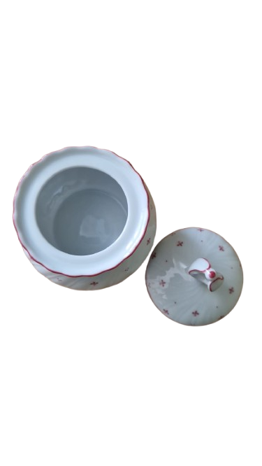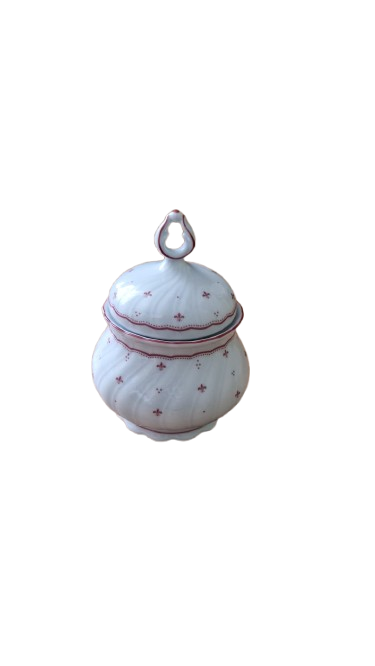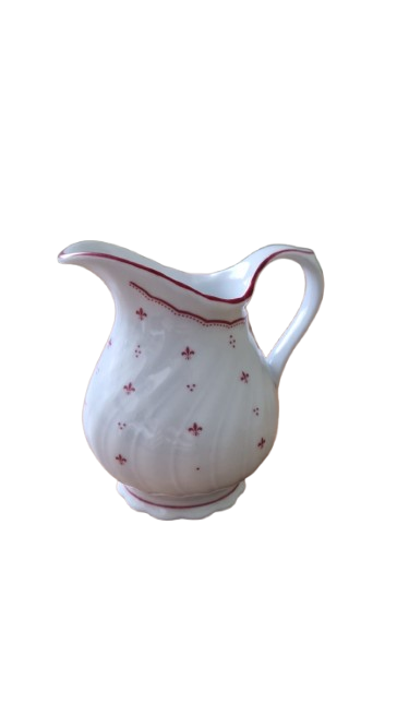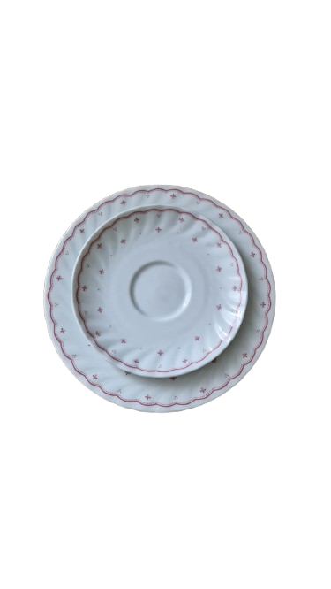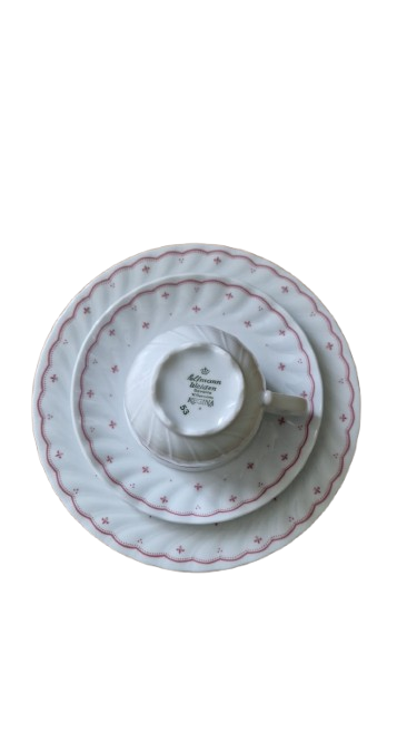 Porcelán je bílý s jemným květinovým vzorem a růžovým lemováním.