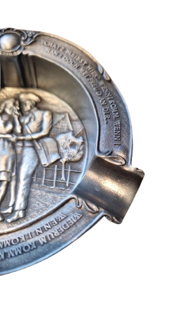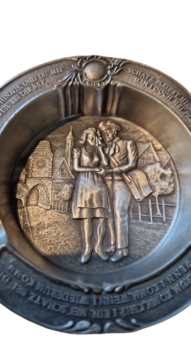 Dekorativní cínový popelník s reliéfním vyobrazením páru a textem po obvodu.
