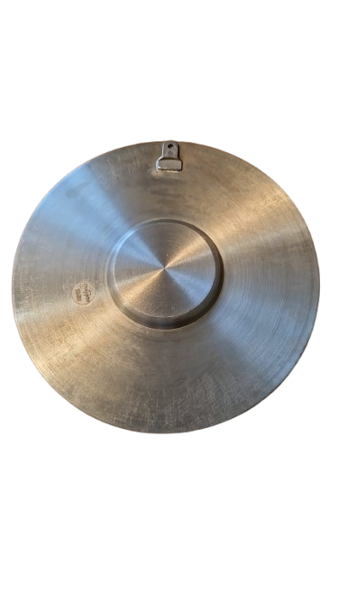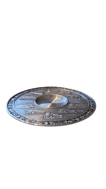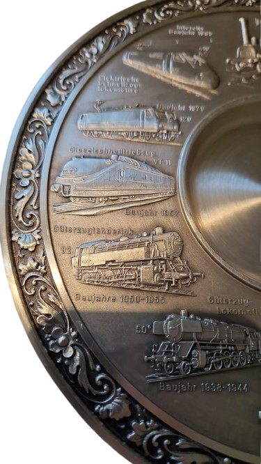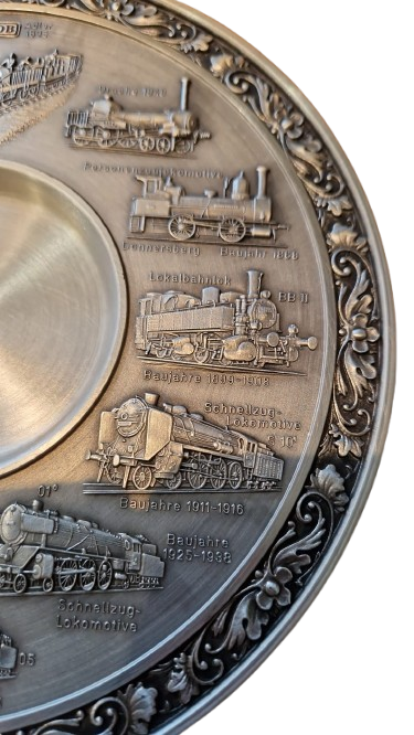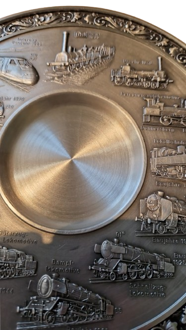 Dekorativní cínový talíř s motivem historických a moderních lokomotiv.