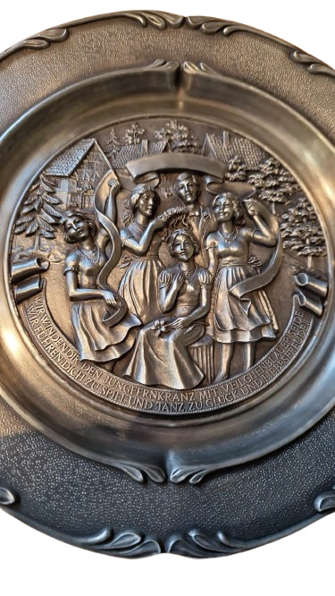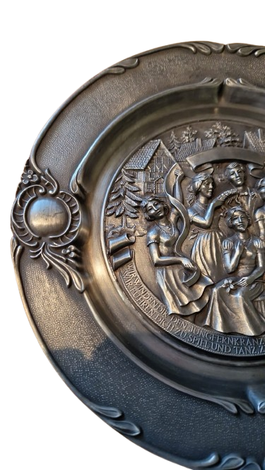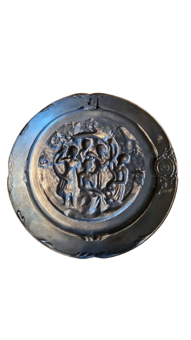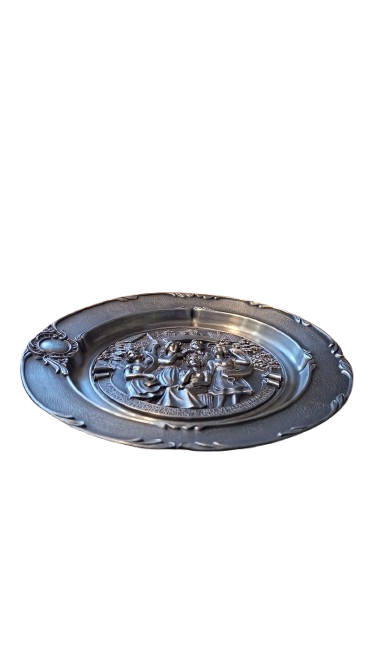 Dekorativní cínový talíř (pewter plate) s reliéfním vyobrazením svatby.