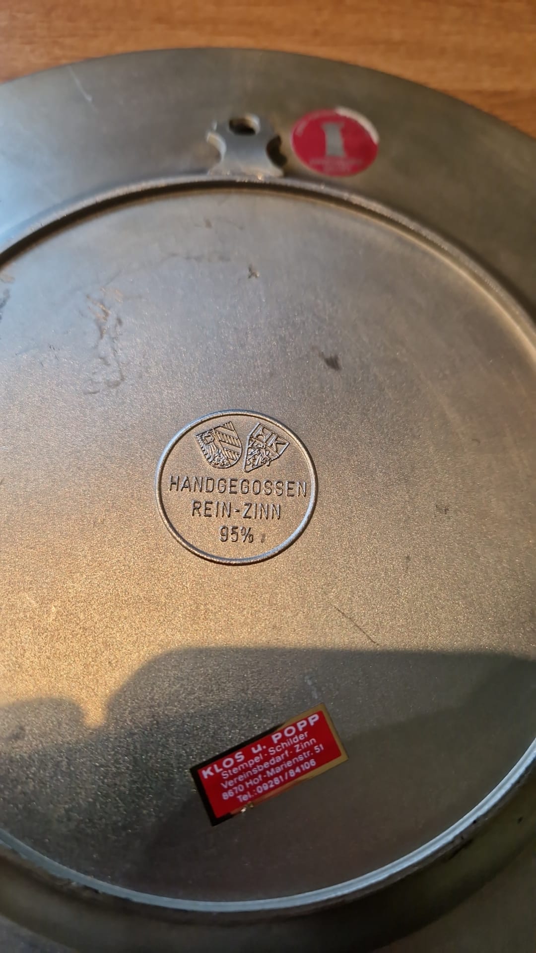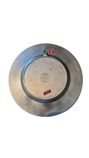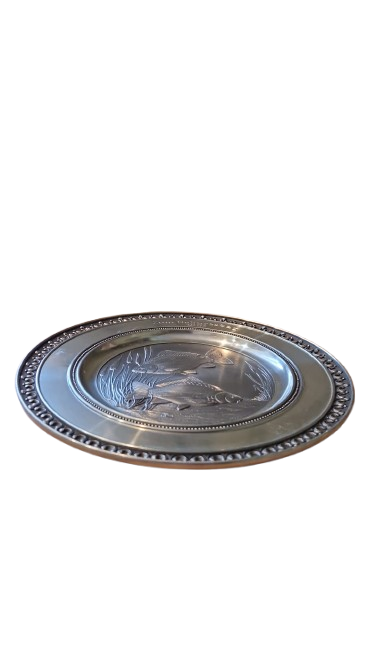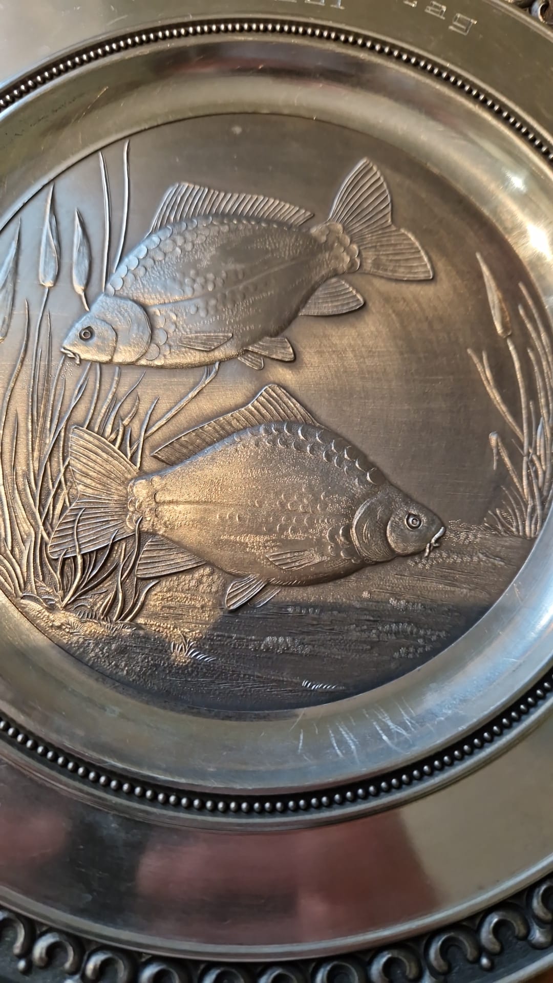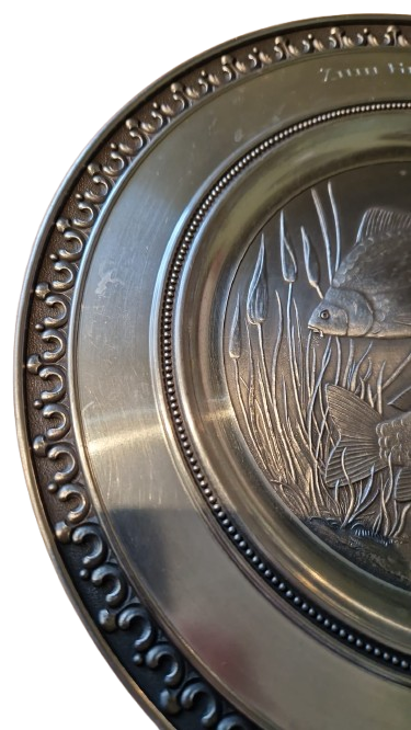 Dekorativní cínový talíř s vyraženým motivem dvou kaprů a rákosu, vyrobený v Německu.