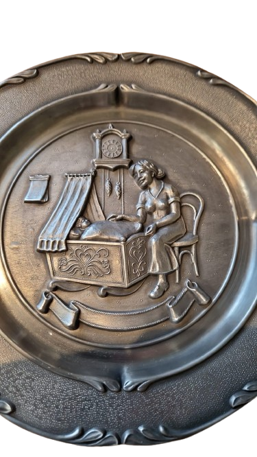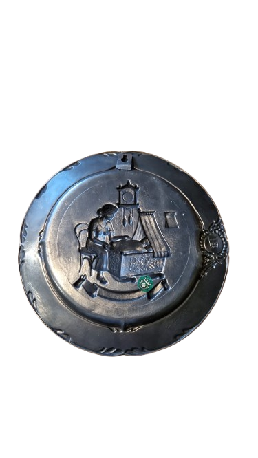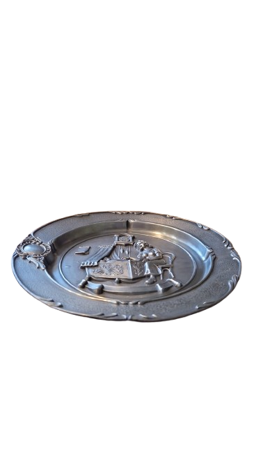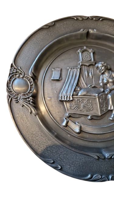Dekorativní cínový talíř (pewter plate) s reliéfním vyobrazením interiérové scény.