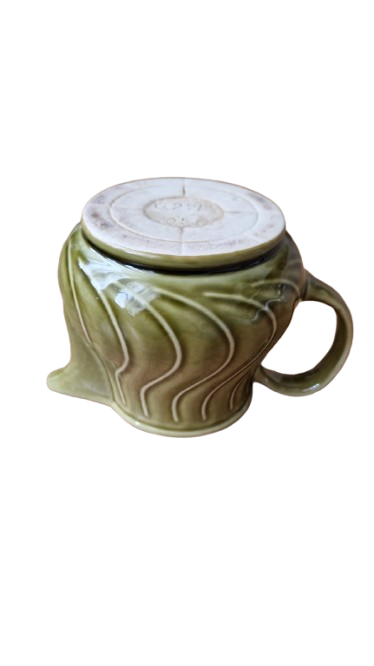 Saténově matná olivová zeleň není jednolitá - díky technice stékavé glazury jemně mění odstín a zdůrazňuje plasticitu vzoru. Působí velmi uklidňujícím dojmem.