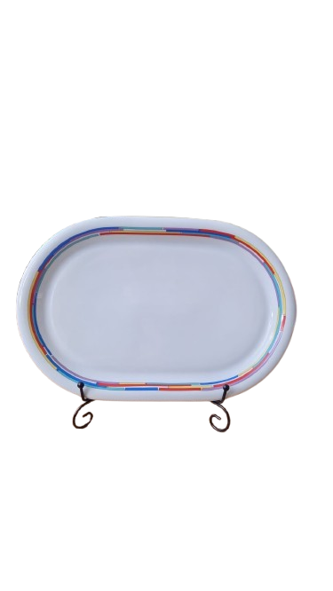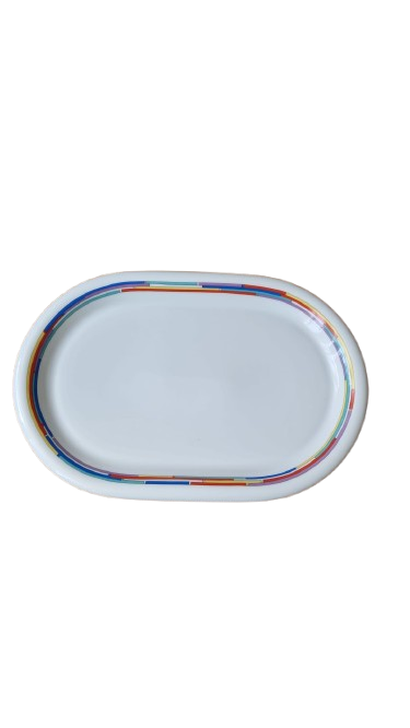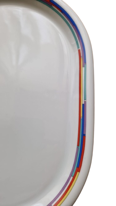 Ikonický oválný servírovací podnos(mísa) od renomované německé porcelánky "Arzberg" Tento kus patří do sběratelsky vyhledávané série "City", kterou navrhl v roce 1989 Lutz Rabold. Je doplněn hravým a nadčasovým dekorem "Daily Rainbow" s pestrobarevnými geometrickými prvky na okraji.