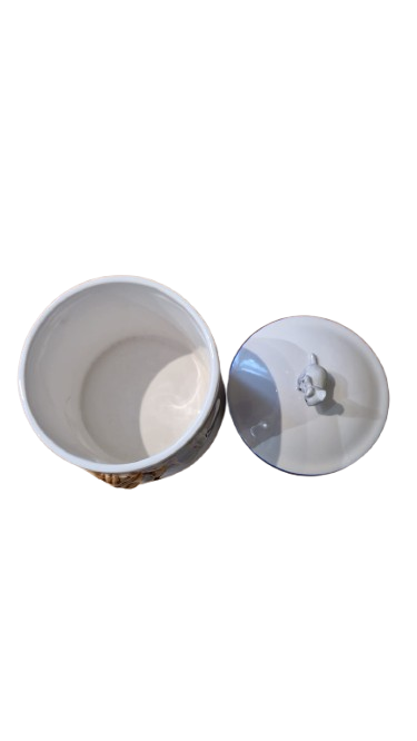 Motiv kočky a myši je plastický, což dodává dóze trojrozměrný vzhled.