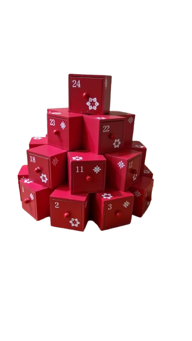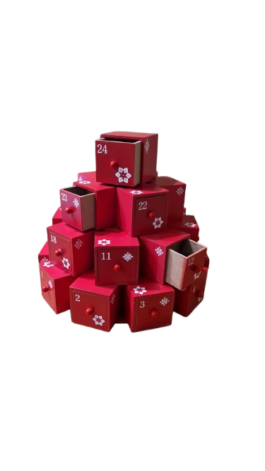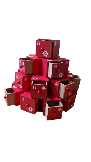 Dřevěný adventní kalendář se skládá z 24 malých červených dřevěných kostek se zásuvkami. Každá zásuvka je označena bílým číslem a má malou rukojeť.