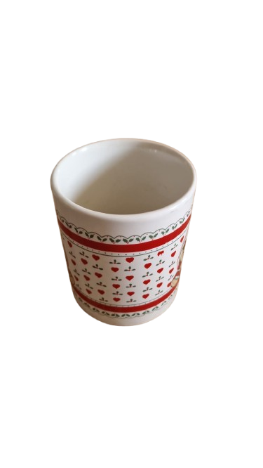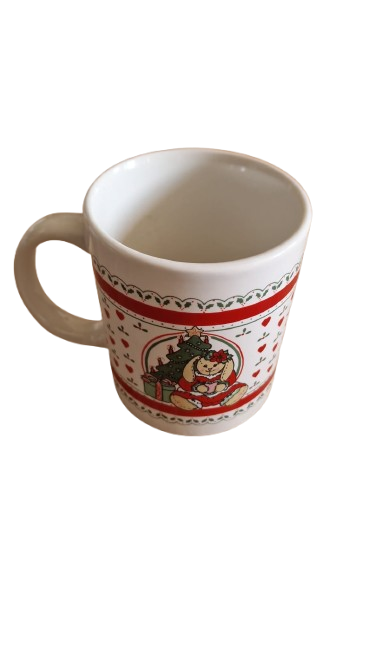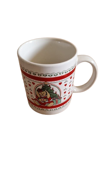 Vánoční hrníček s motivem roztomilého zajíčka s vánočním stromečkem a dárky