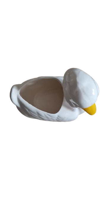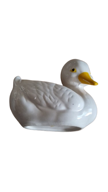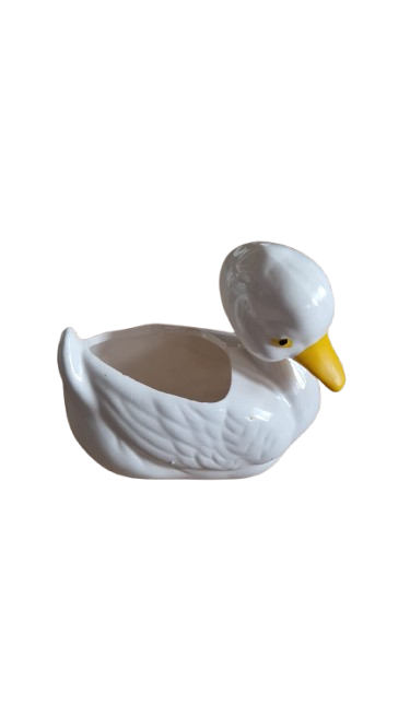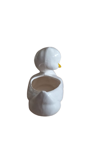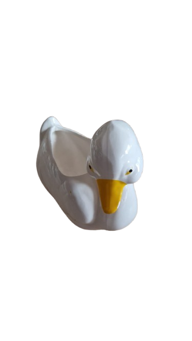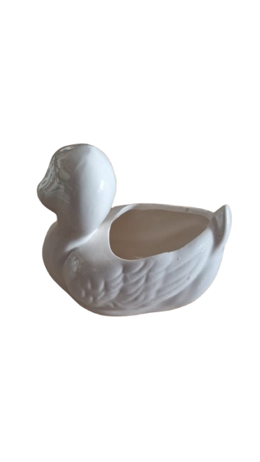 Keramická figurka kachničky, kterou lze použít jako květináč nebo odkládací místo na drobnosti.