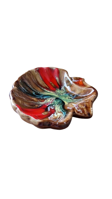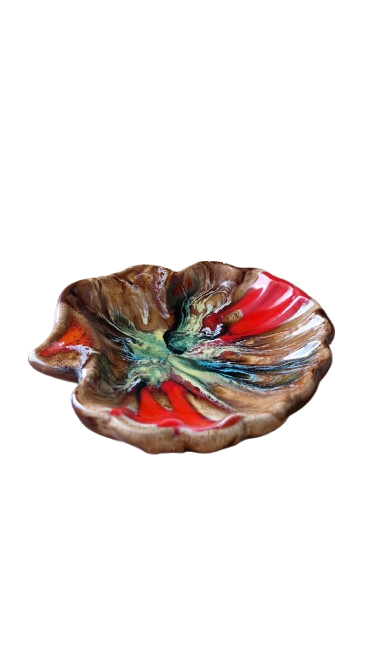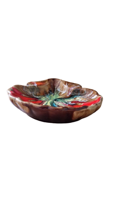 Mísa se vyznačuje hlubokými, vícebarevnými glazurami, které se prolínají v jedinečné kompozici.