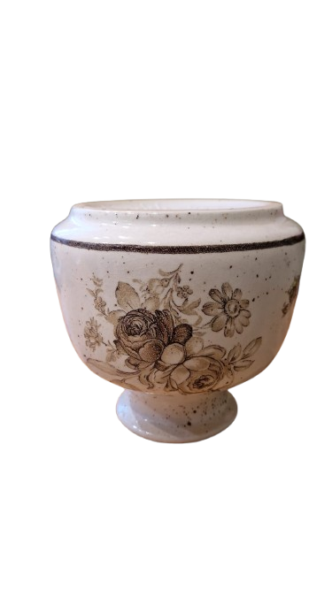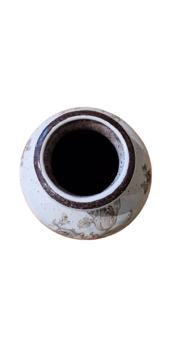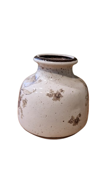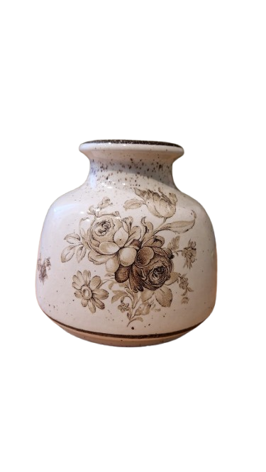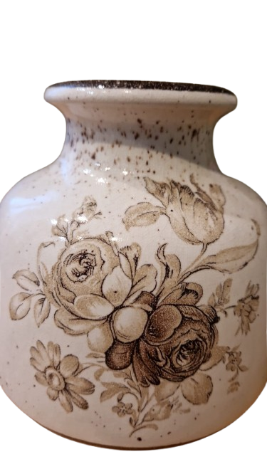 Vintage keramická váza značky "Scheurich Keramik" zdobená detailními, hnědými květinovými motivy a motivy listů s kulatým tvarem a rozšířeným hrdlem.