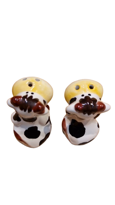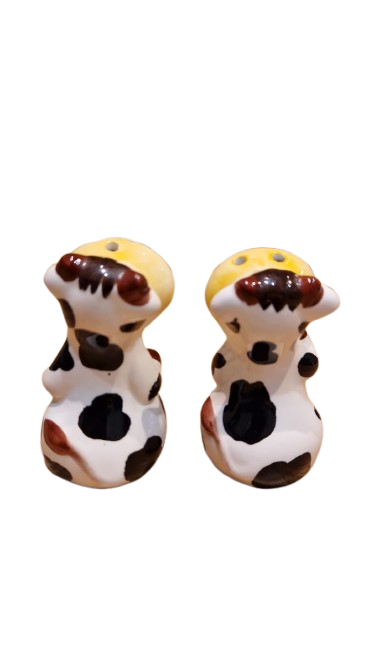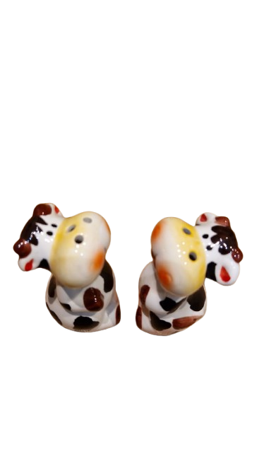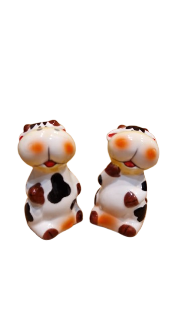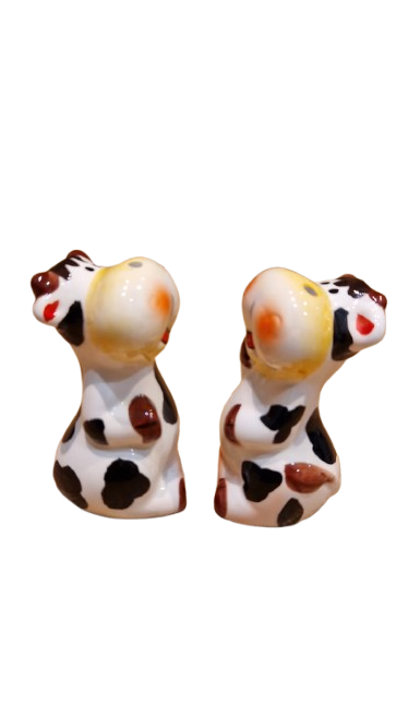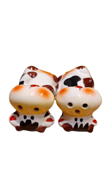 Roztomilá sada keramických figurek kraviček, které slouží jako solnička a pepřenka. Mají krásnou lesklou glazuru a výrazné barvy.