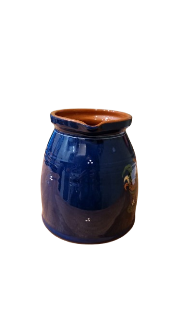 Robustní keramický džbán pokrytý tmavou, lesklou kobaltově modrou glazurou s motivem drůbeže.