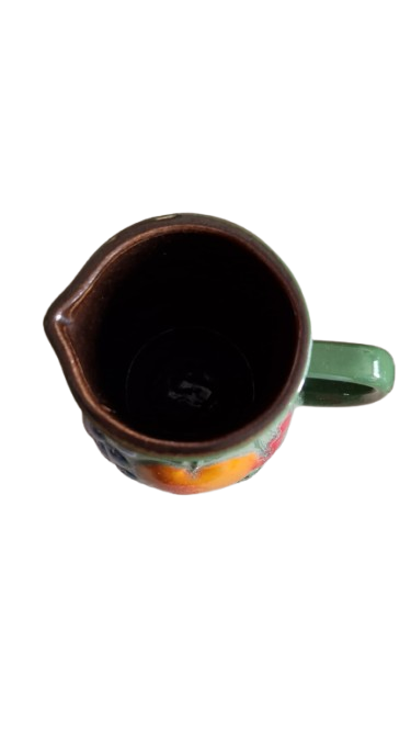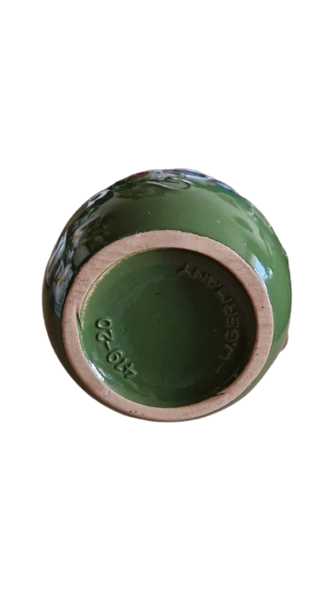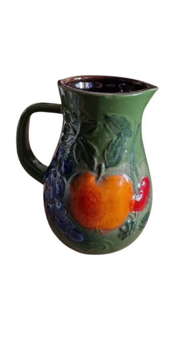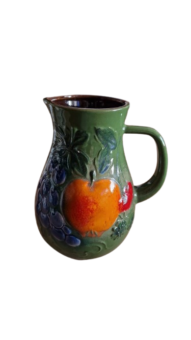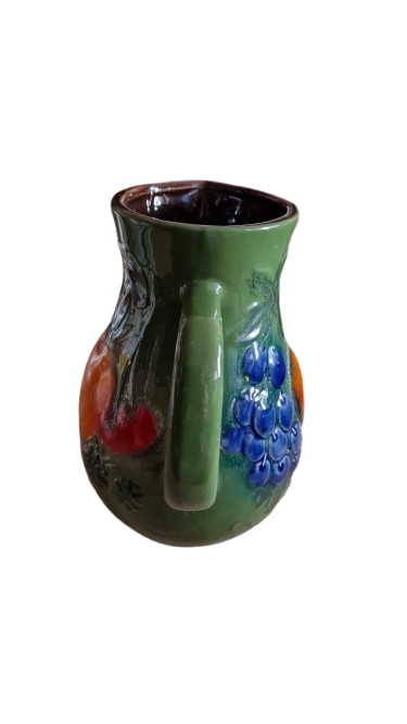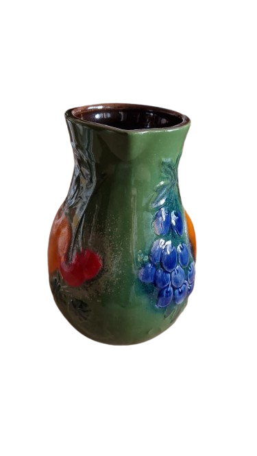 Keramický džbán 419-20 zdobený reliéfními motivy ovoce, jako jsou hrozny, jablko a třešně. Má zelenou glazuru a hnědý vnitřek.