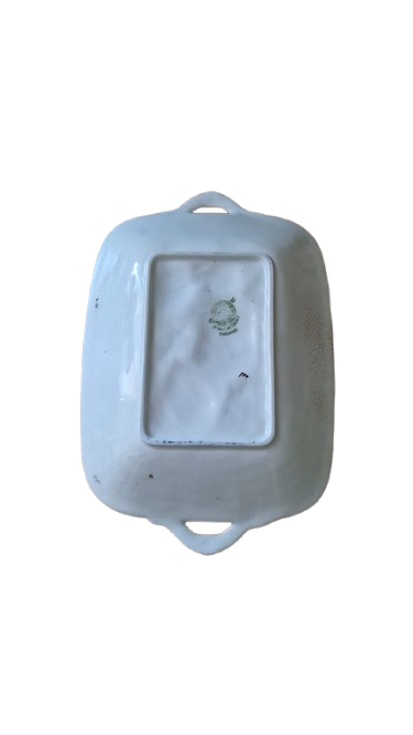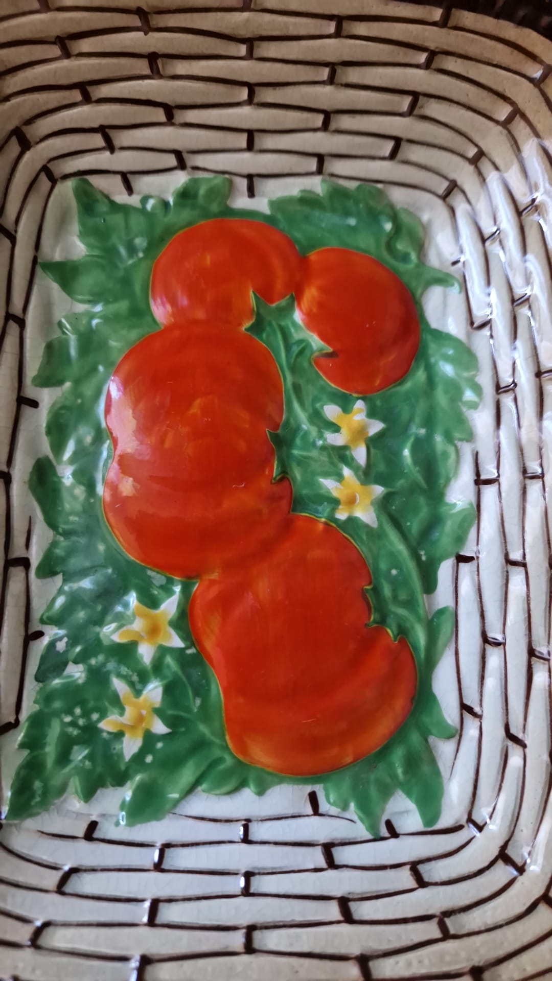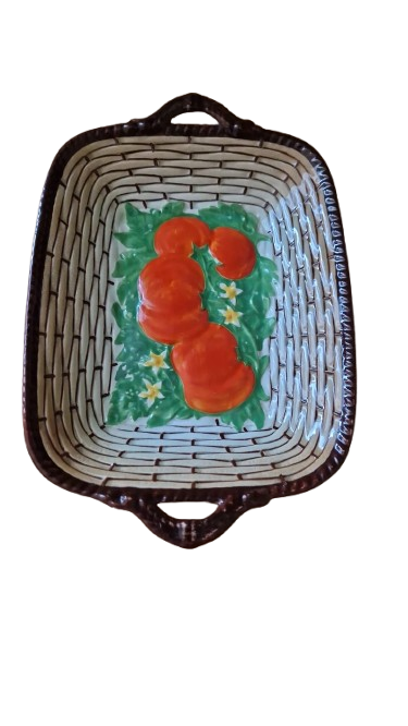Keramický tác, známý jako Royal Winton Grimwades lustre basket, který byl vyroben v Anglii. Tento konkrétní kus je součástí kolekce "Salad ware" a zdobí ho motiv rajčat na zelených listech.