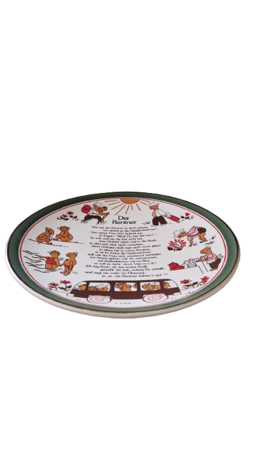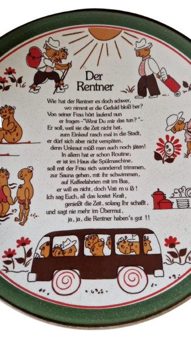 Keramický talíř od německého výrobce Schramberger Majolika-Fabrik (SMF) zdobený kresbami důchodců v různých situacích a básní s názvem "Der Rentner" (Důchodce).