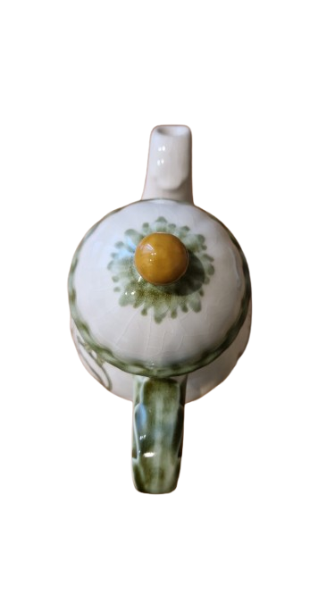 Konvička je ručně malovaná s motivem květin a zelených listů. Má klasický zaoblený tvar s prohnutou hubičkou a zaobleným ouškem. Okraj víčka a ouška je ozdobný, vlnkovaný zelený vzor.
