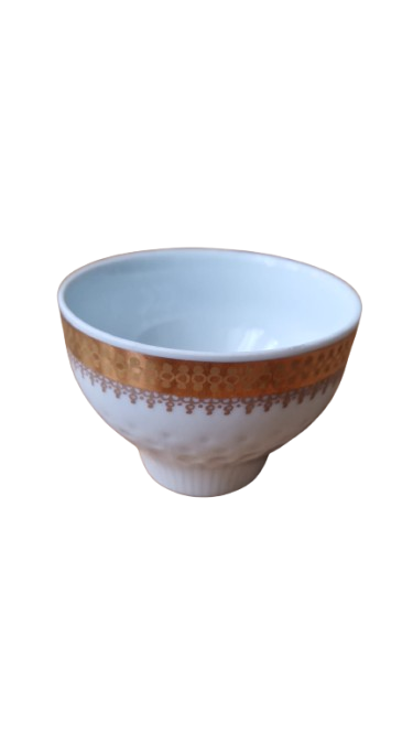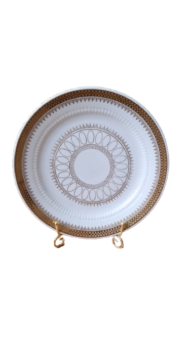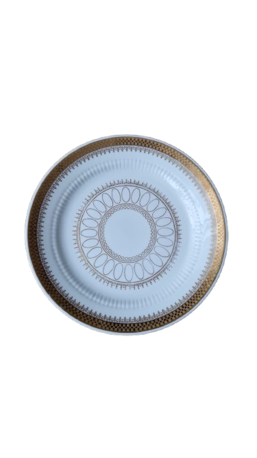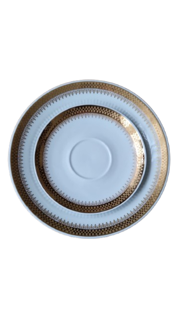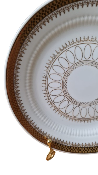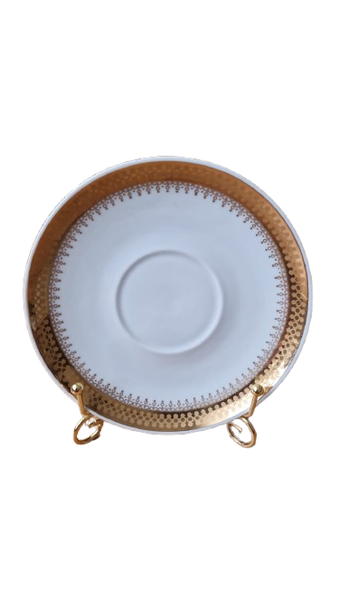 Okraje jsou dekorovány širokým pásem z 24 karátového zlata s precizním leptaným filigránem. Zlacení je ve vysokém lesku a v perfektním stavu.