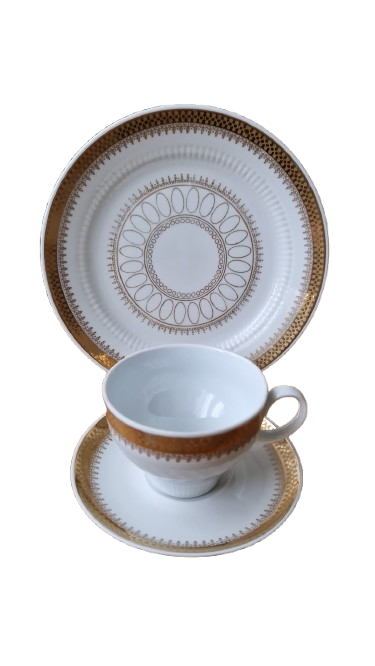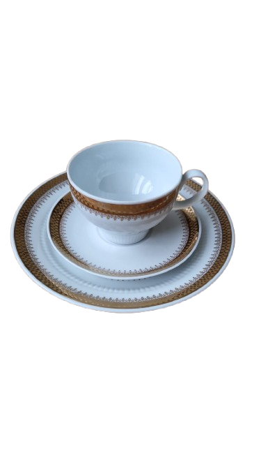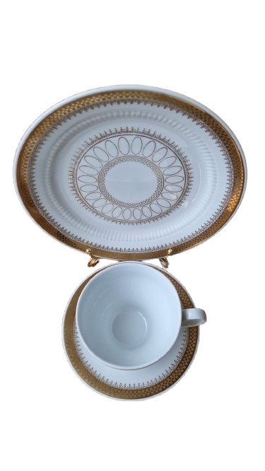 Exkluzivní třídílný set (šálek, podšálek, dezertní talíř) z proslulé německé porcelánky "Kahla", vyroben7 v 60. - 70. letech minulého století (období NDR).