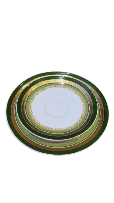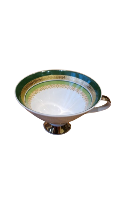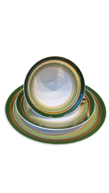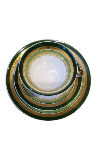 Luxusní třídílný set (trio) z renomované německé porcelánky "Mitterteich Bavaria". Tento kus představuje vrchol poválečné elegance 50. a 60. let a kombinuje precizní německé řemeslo s odvážným barevným konceptem.