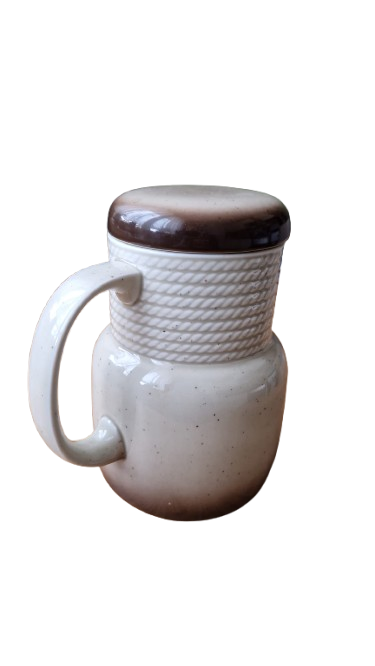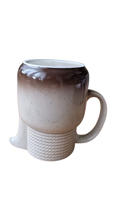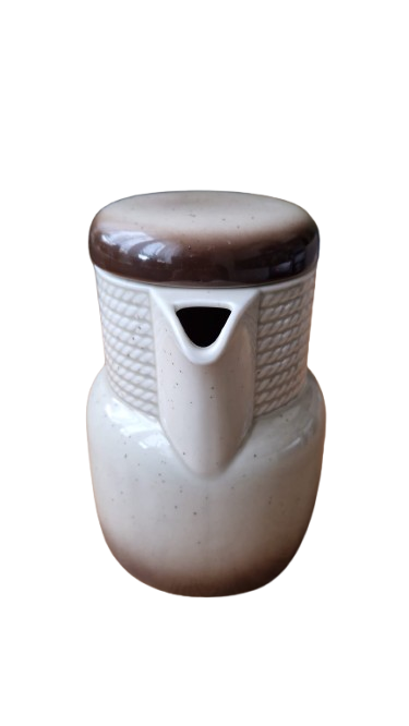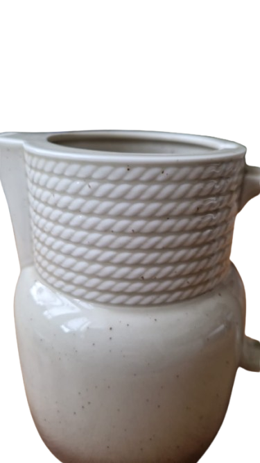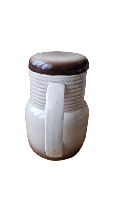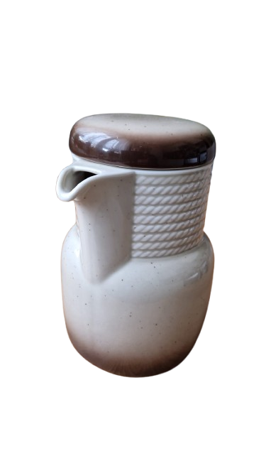 Horní část konvice tvoří výrazný plastický dekor pleteného lana, který plynule přechází do hladkého těla s efektním ombré přechodem (od krémové po tmavě čokoládovou u dna). konvice je včetně originálního víčka, které barevně doplňuje tmavou základnu a uzavírá tak harmonický vzhled celého kusu.