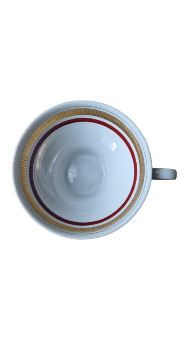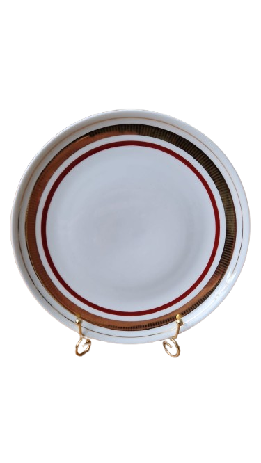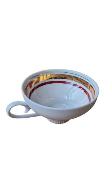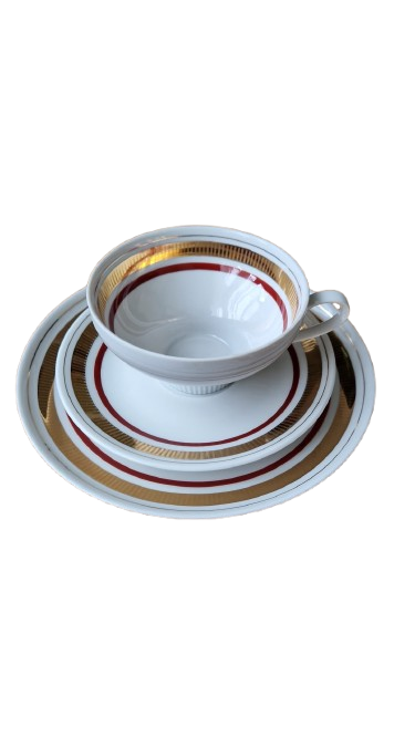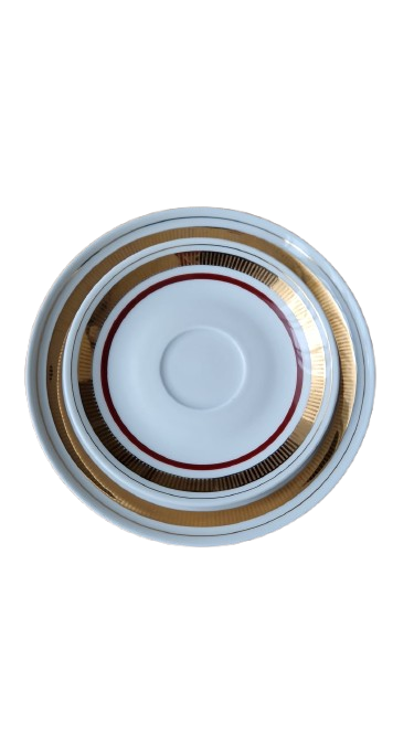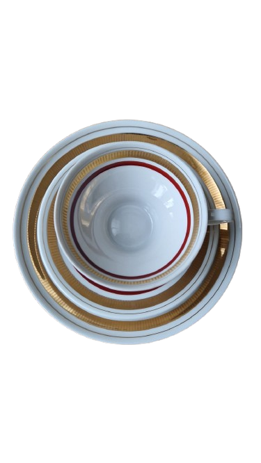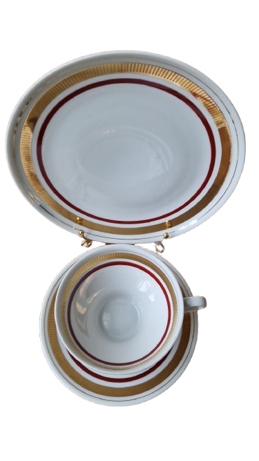 Elegantní designový skvost z legendární německé porcelánky "Colditz". Tento servis je dokonalým ztělesněním estetiky 60. a 70. let. Kombinace hluboké vínové barva a bohatého zlacení působí nadčasově a luxusně - ideální pro ty, kteří chtějí spojit nostalgii retra s moderním stolováním.