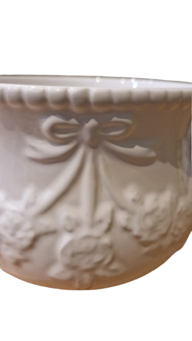 Keramický bílý kulatý obal/květináč s jemným, romantickým, reliéfním dekorem růží a mašlí.