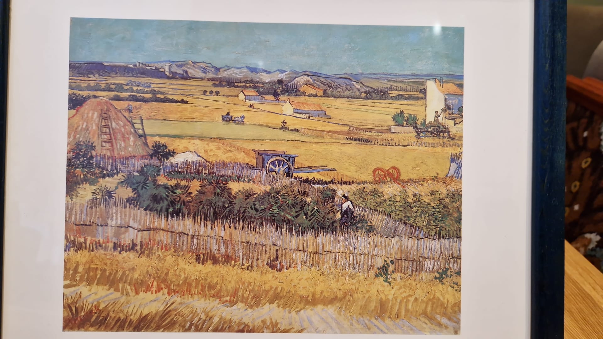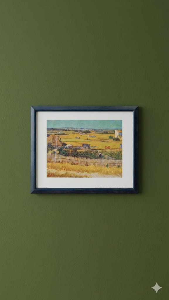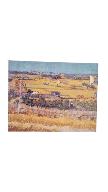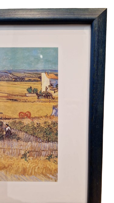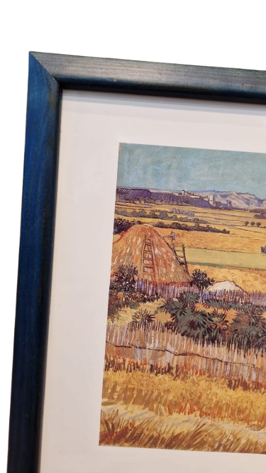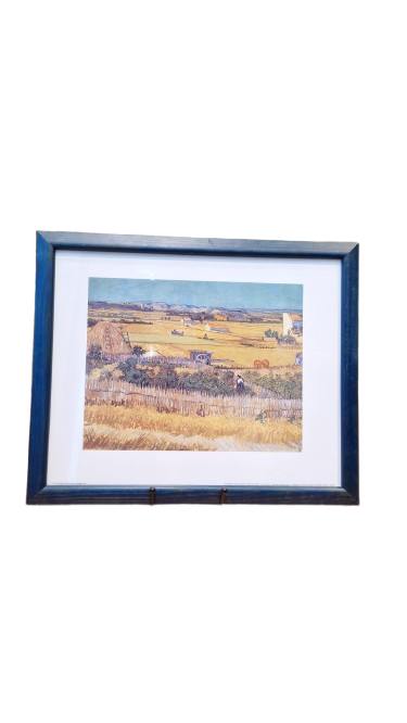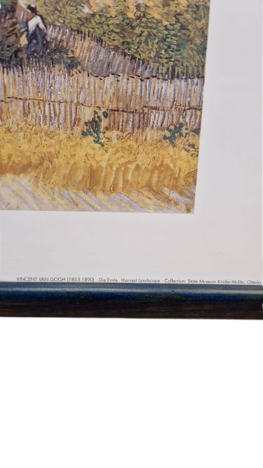 Zarámovaná reprodukce slavného díla Vincenta van Gogha (1853-1890) s názvem "Sklizeň v La Crau" (Die Ernte / The Harvest). Obraz zachovává typické syté barvy a postimpresionistický styl autora. Reprodukce obsahuje popisek s informacemi o autorovi a původní sbírce (Kröller - Müller Museum).