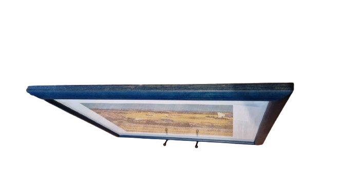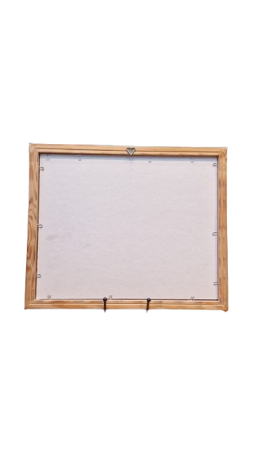 Obraz má dřevěný, modře mořený rám s bílou paspartou a sklem. Na zadní straně je očko pro zavěšení.