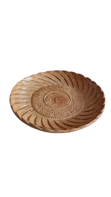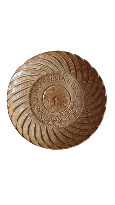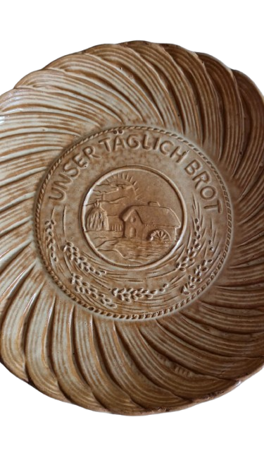 Keramický podnos nebo talíř na chleba, který má na dně vyražený nápis "Unser Täglich Brot" (Náš každodenní chleb) a obrázek zemědělské scény.