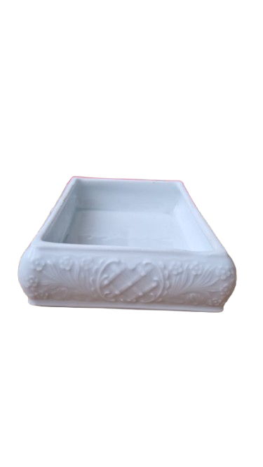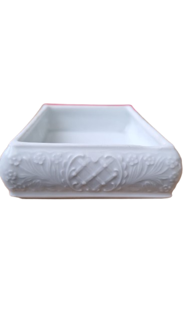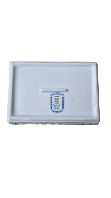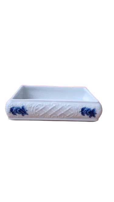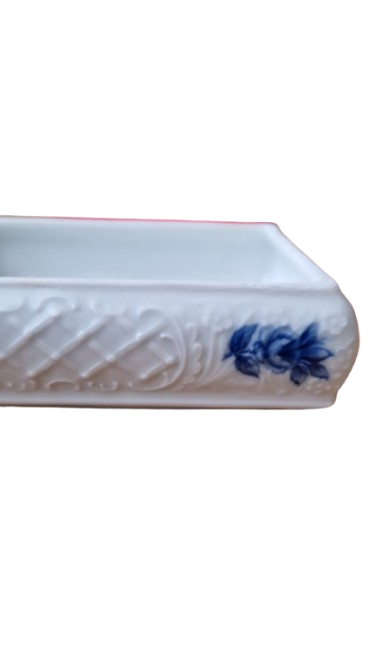 Miska má tradiční reliéfní dekor s motivy pleteného košíku a květinovými detaily v kobaltově modré barvě.
