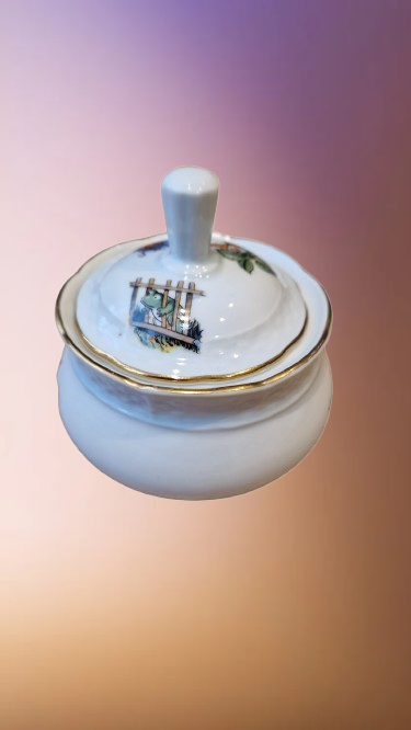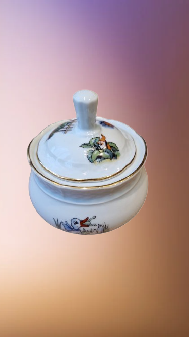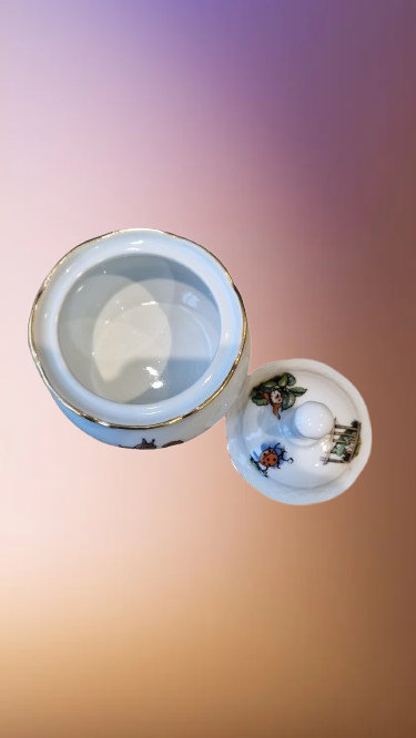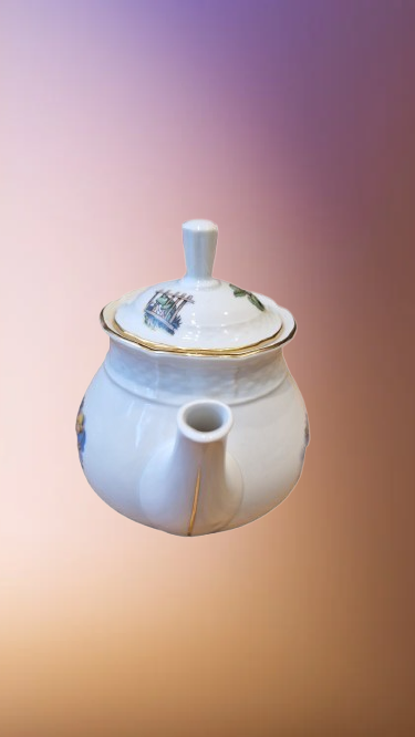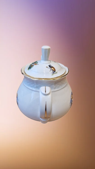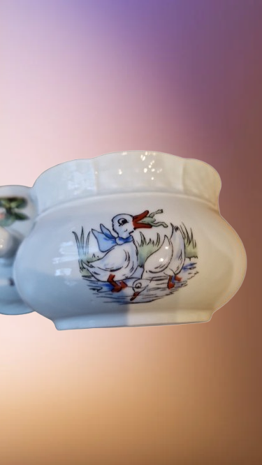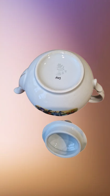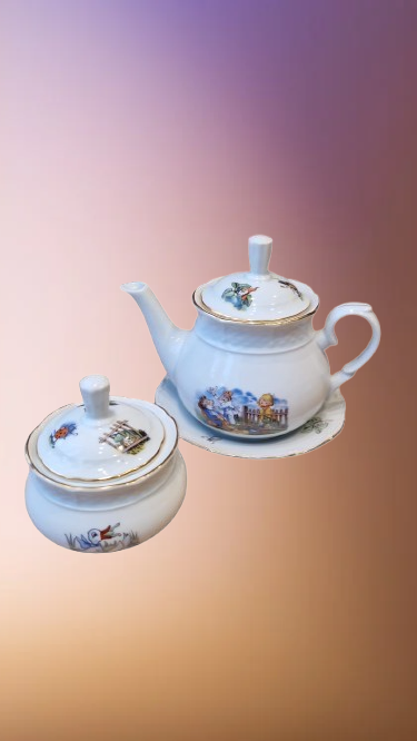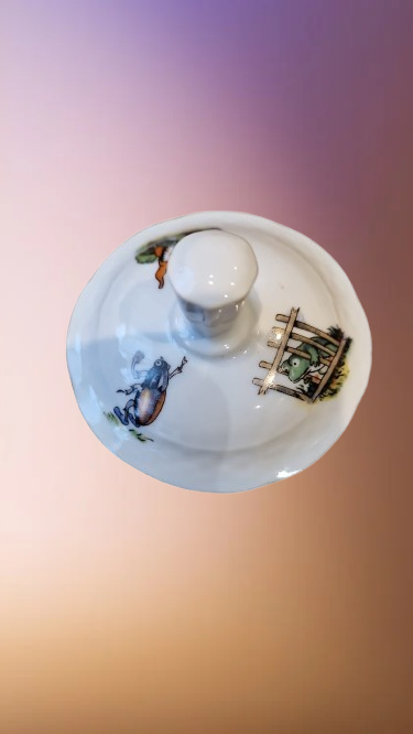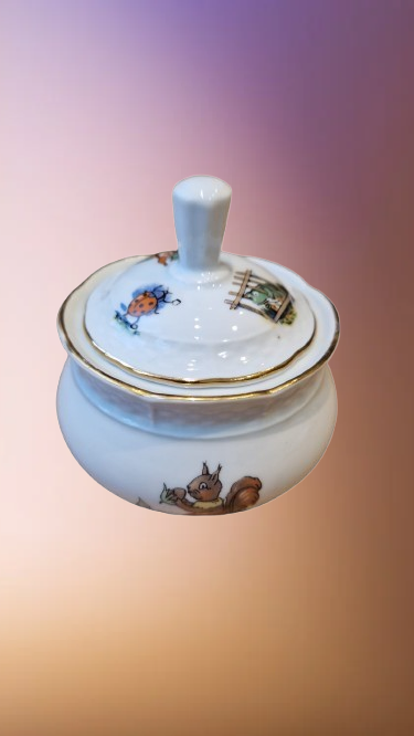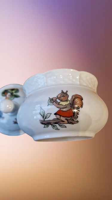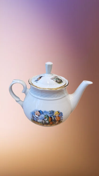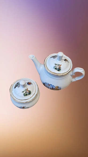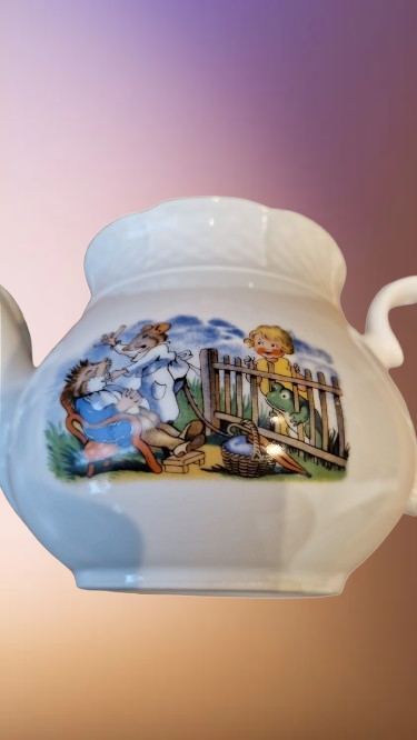 Okouzlující část dětského čajového servisu, který v sobě spojuje staletou tradici českého porcelánu a nesmrtelný humor klasické literatury. Tato souprava z porcelánky "Thun" v Klášterci na Ohří (značeno TK Czechoslovakia) patří do elegantní tvarové řady "Natalie", která je typická svým jemným reliéfním vlněním a nadčasovým designem.