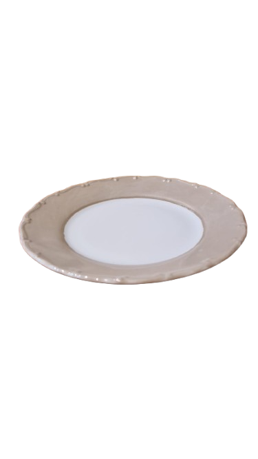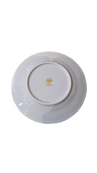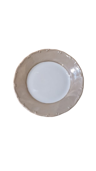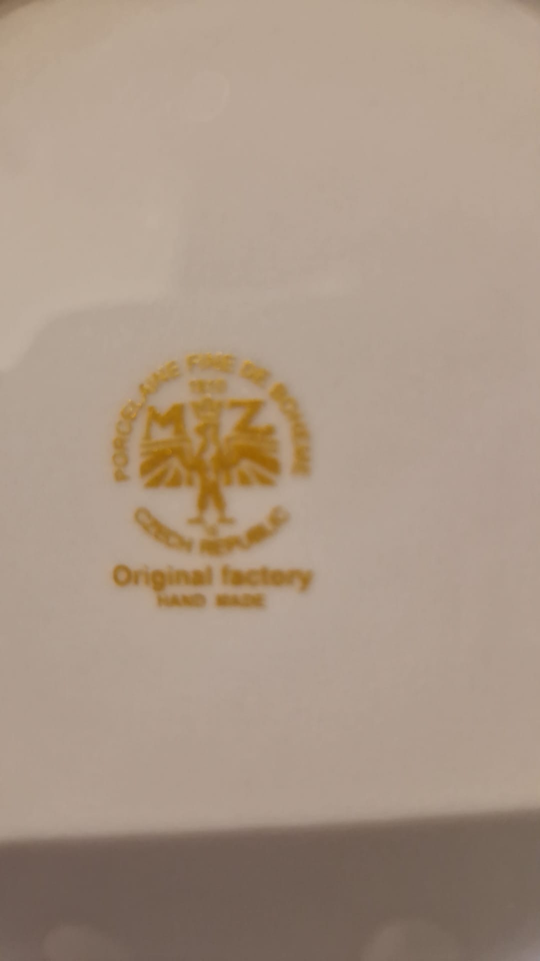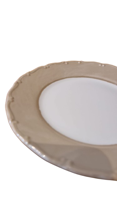 Sada šesti dezertních porcelánových talířů od společnosti "Bohemia Porcelán MZ 1810 s. r.o. s béžovým/pískovým dekorovaným (reliéfním) okrajem, ručně malované.