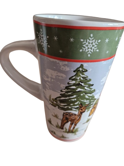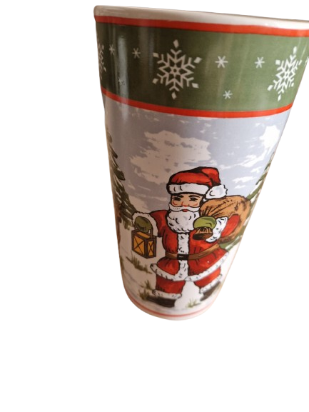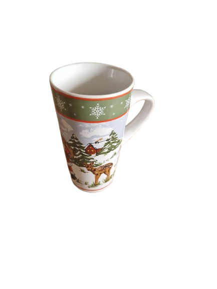 Porcelánový hrnek s vánočním motivem...zasněžená krajina, domeček, stromy, sob a Santa Claus