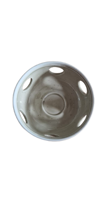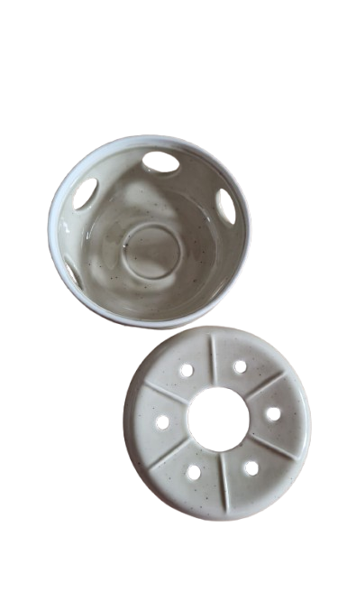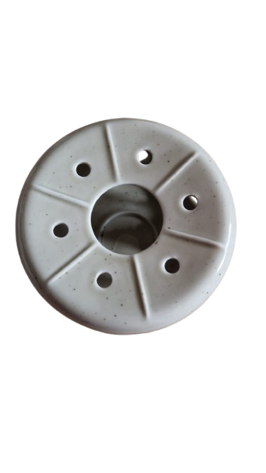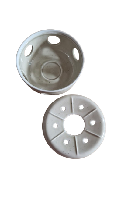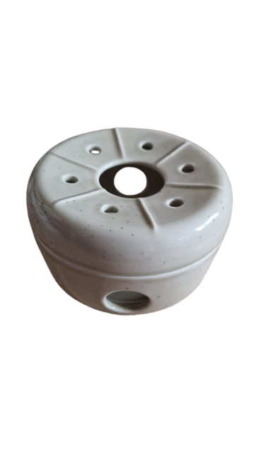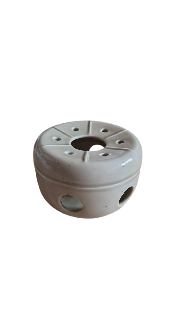 Porcelánový ohřívač čajových konvic "Thomas Scandic", často používaný k udržení teploty čaje v konvici pomocí čajové svíčky umístěné uvnitř. Design zahrnuje otvory pro cirkulaci vzduchu a pro umístění čajové svíčky.