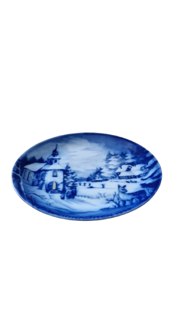 Sběratelský vánoční porcelánový talíř s motivem zimní krajiny - Durynského lesa, kostela a srnky. Talíř je modrobílý a ve spodní části je nápis "Weihnachten 1995" (Vánoce).