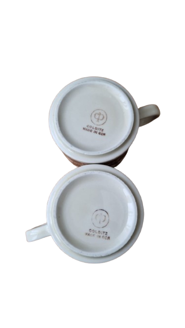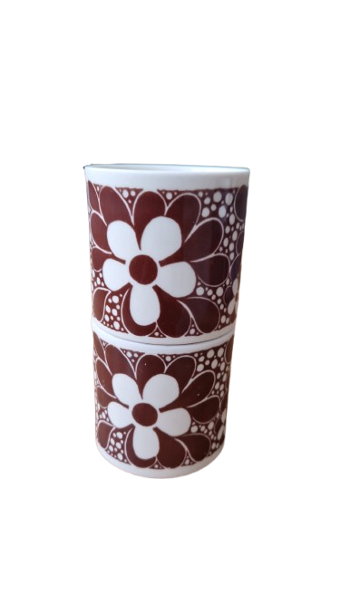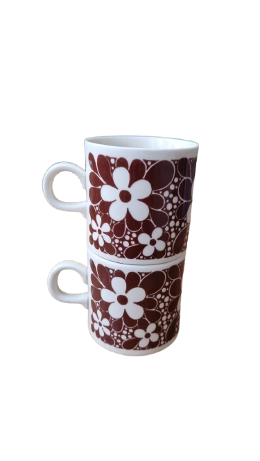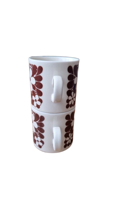 Dvojice ikonických retro hrnků vyrobených v legendární německé porcelánce "VEB Porzellanwerk Colditz" (NDR). Hrnky jsou zdobeny typickým hnědým květinovým vzorem, který je symbolem designu 70. let.