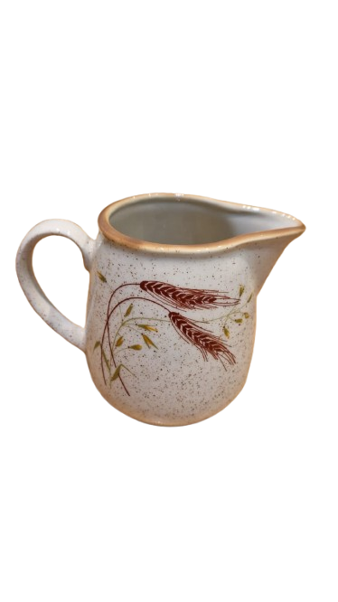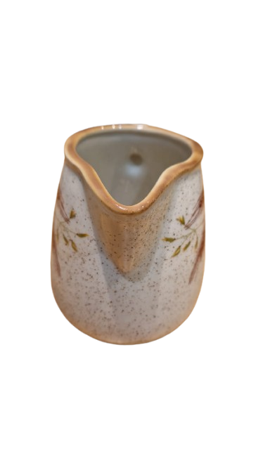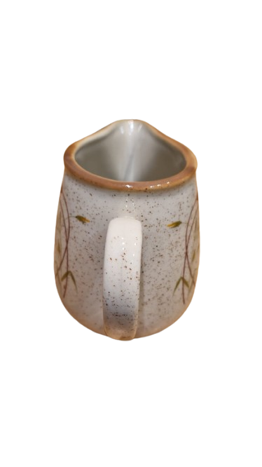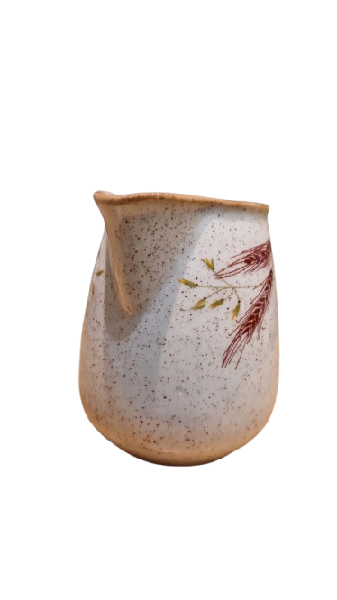 Džbánek má nadčasový design - světlá kamenina s jemným kropenatým efektem (speckled glaze) a ručně malovaným motivem obilných klasů v podzimních tónech.
