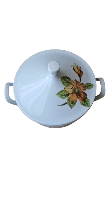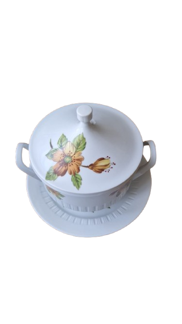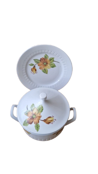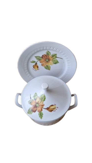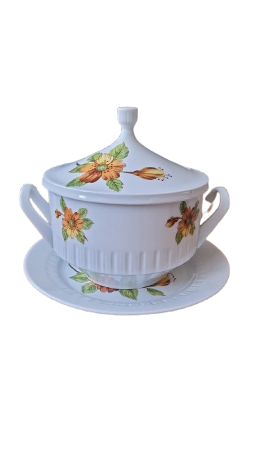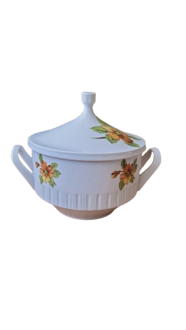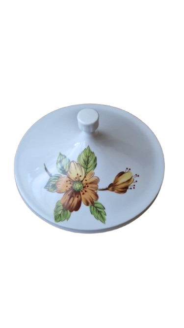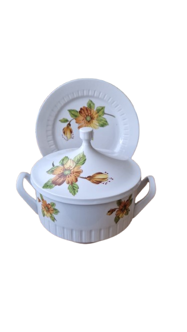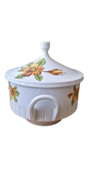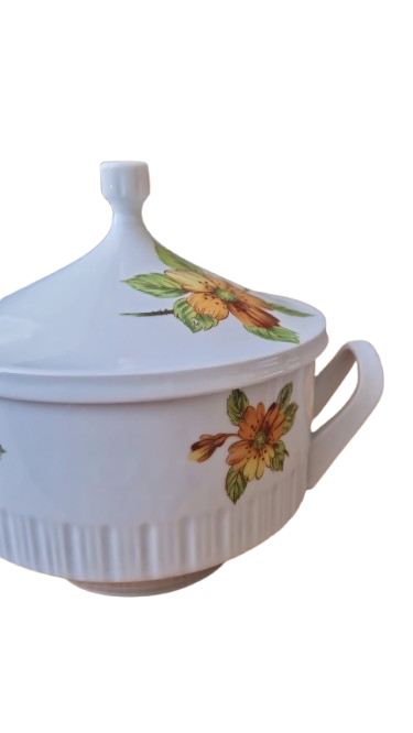 Terina je vyrobena s bílého glazovaného porcelánu s jemným svislým vroubkováním (kanelováním) a výrazným květinovým dekorem v hřejivých tónech oranžové a žluté.