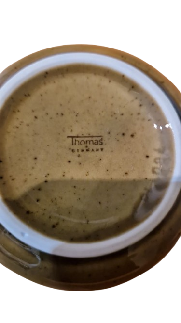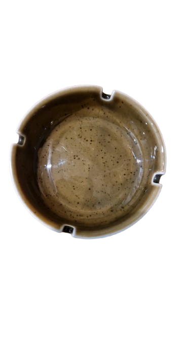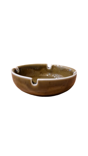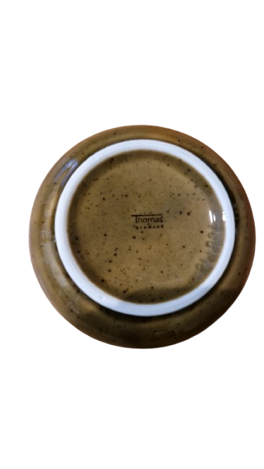 Retro keramický popelník od značky "Thomas" s designem zrnité hnědé/olivové glazury (tzv. speckled glaze nebo Fleckenglasur).