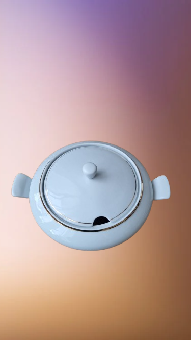 Elegantní porcelánová mísa s víkem (terina) od světoznámé značky "Kahla", vyrobena v 60. a 70. letech v tehdejším Východním Německu (GDR). Tento kus je dokonalým příkladem bruselského stylu a modernistického designu, který se dnes vrací do módy.