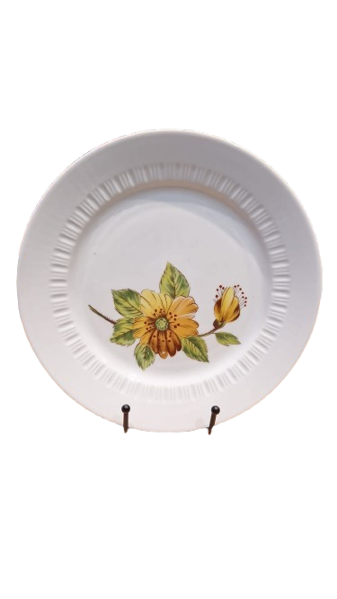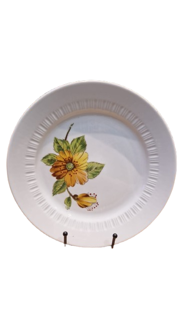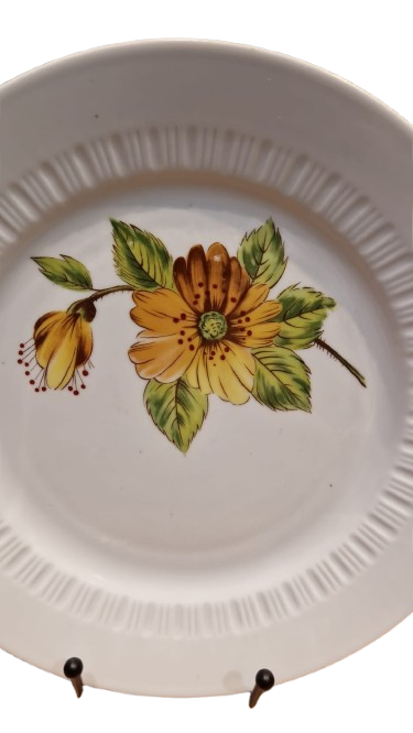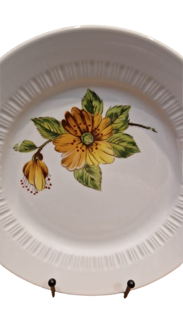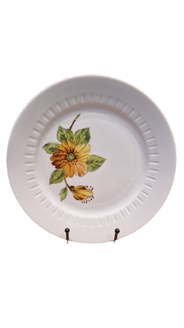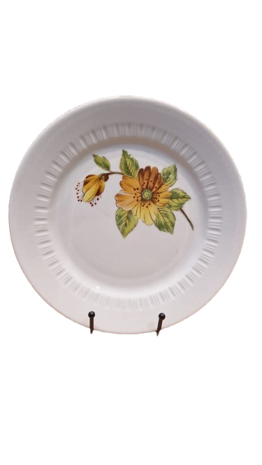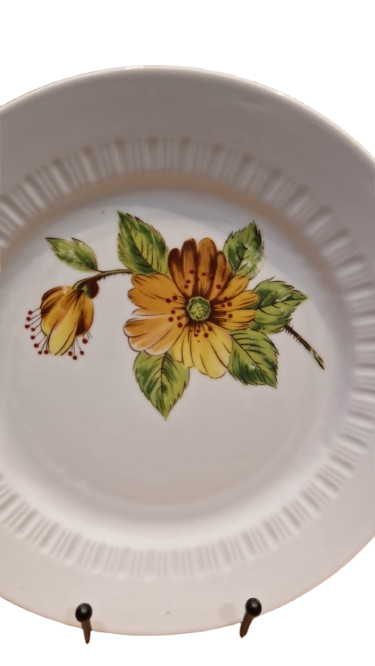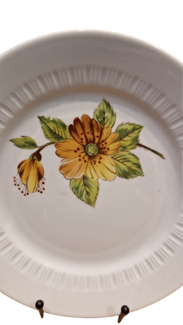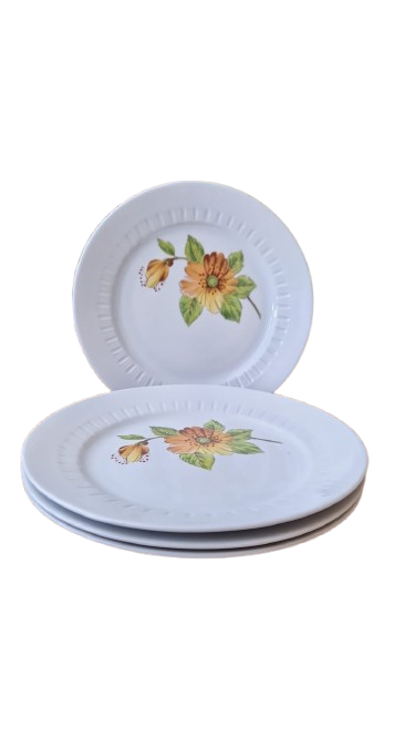 Talíře jsou vyrobené s bílého glazovaného porcelánu s jemným svislým vroubkováním (kanelováním) a výrazným květinovým dekorem v hřejivých tónech oranžové a žluté.