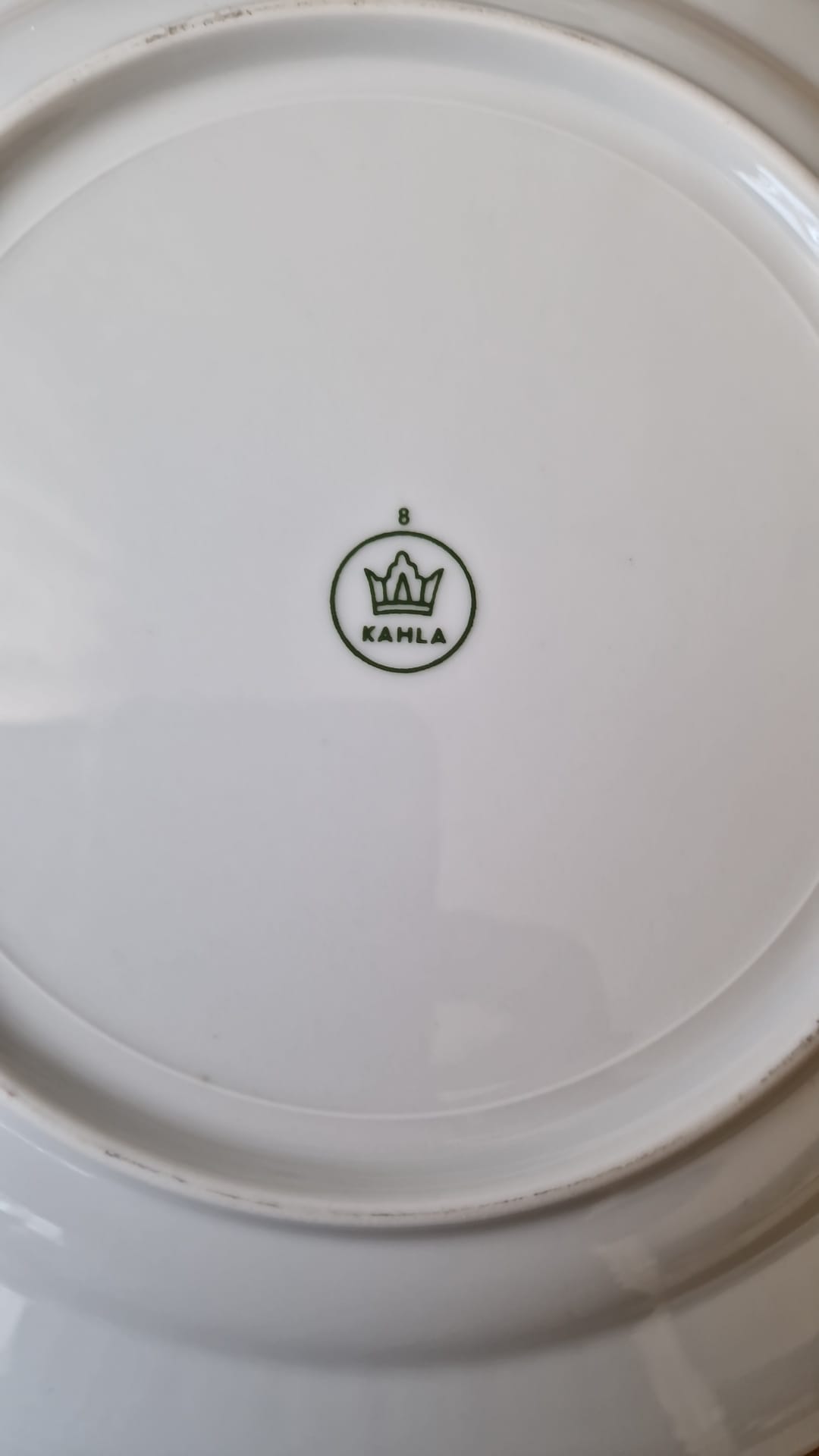 Krásná sada porcelánových talířů od renomované německé značky "Kahla". Jedná se o originální kousek z éry NDR (60.-70. léta), značený klasickou zelenou korunkou. Jako bonus v rámci akce 2+2 přidáváme ke koupi dvou talířů další dva talíře ze stejné série zcela zdarma.