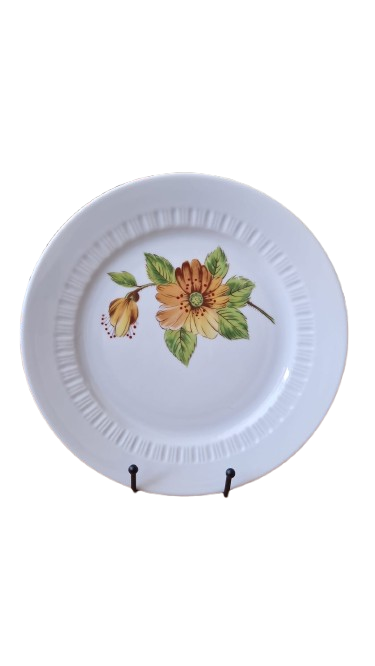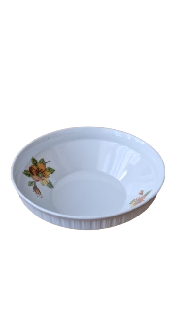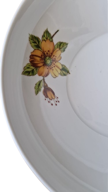 Mísa je vyrobena s bílého glazovaného porcelánu s jemným svislým vroubkováním (kanelováním) a výrazným květinovým dekorem v hřejivých tónech oranžové a žluté.
