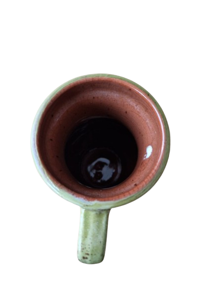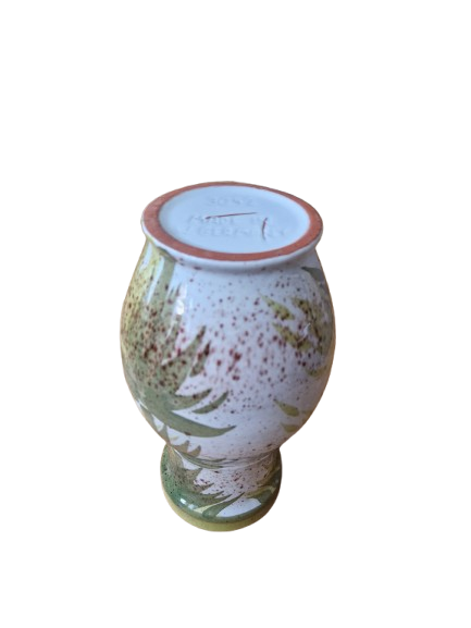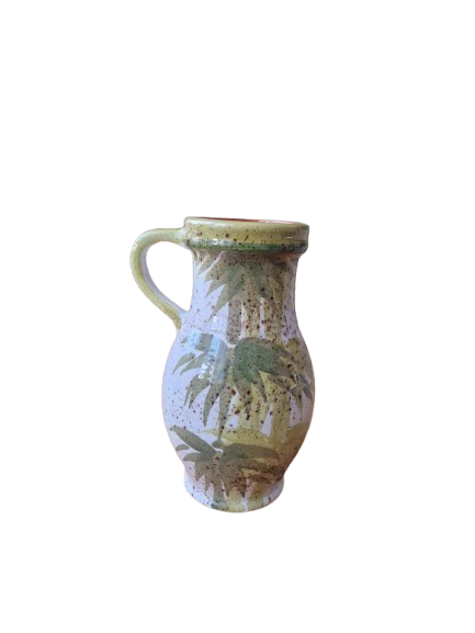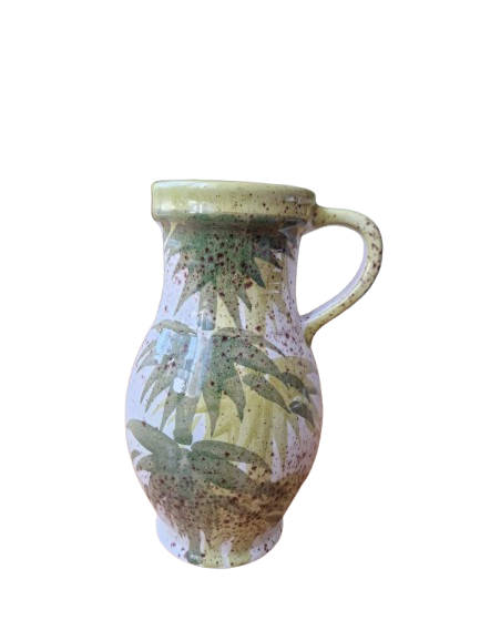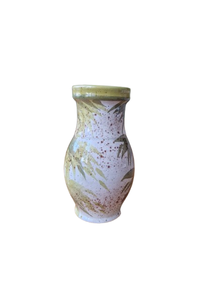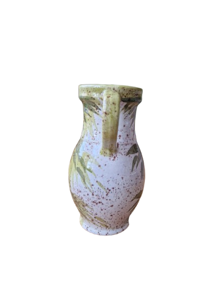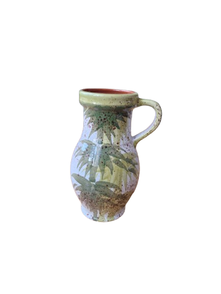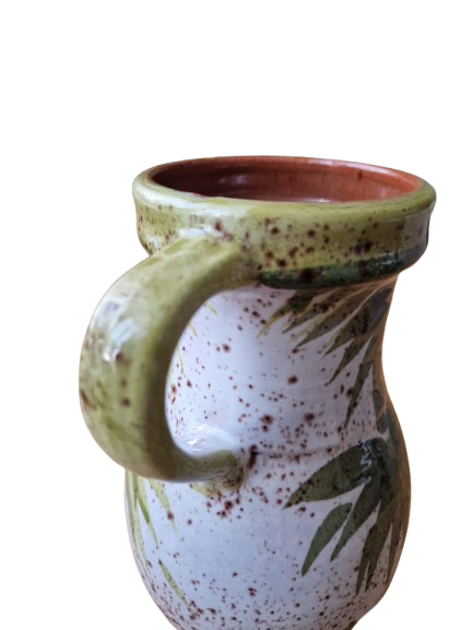 Váza má elegantní organický tvar s uchem a je zdobena ručně malovaným botanickým motivem (stylizované bambusové nebo palmové listy) v přírodních zelených a hnědých tónech na jemně kropenatém podkladu. Vnitřní glazura je tmavě hnědá, vysoce lesklá.