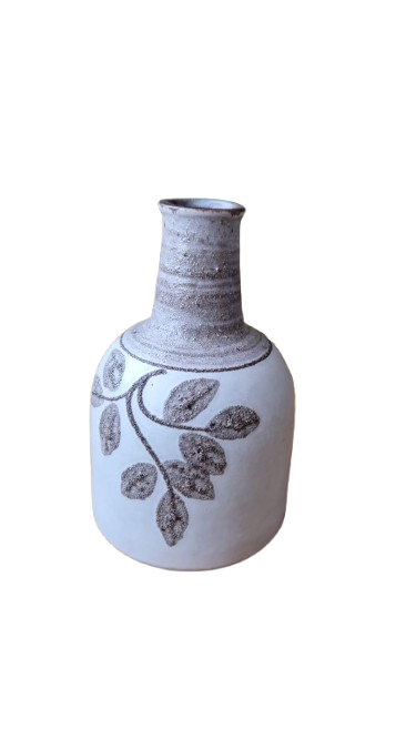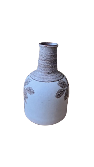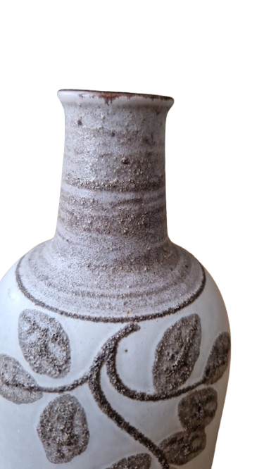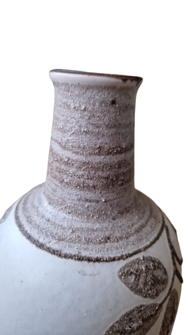 Váza je vyvedena v typickém modernistickém stylu té doby s výrazným kontrastem mezi hladkým béžovým tělem a hrubou, zrnitou strukturou dekoru. Vystouplý rostlinný motiv (listy) v zemité hnědé barvě s "vulkanickou" texturou (tzv. Fat Lava).