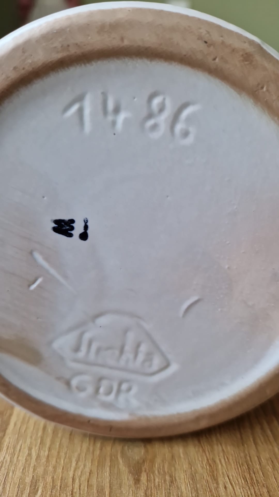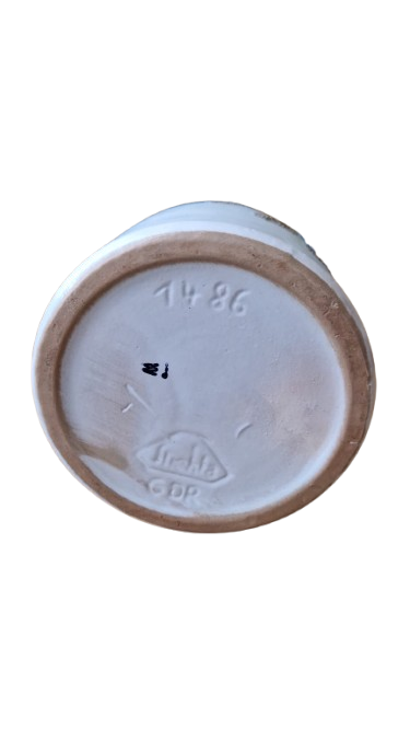 Váza je vyrobena z glazované keramiky. Na dně má vyraženo číslo modelu "1486" a originální logo výrobce Strehla s označením GDR.