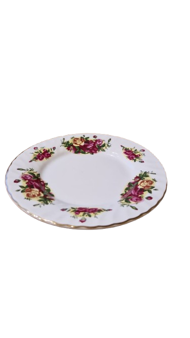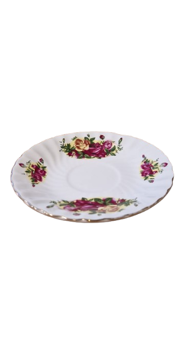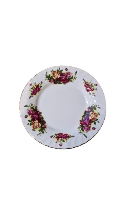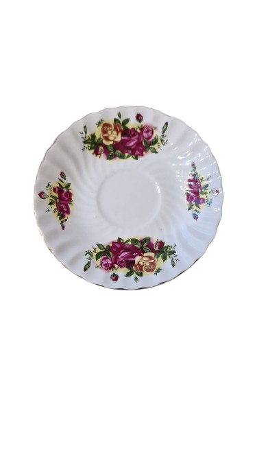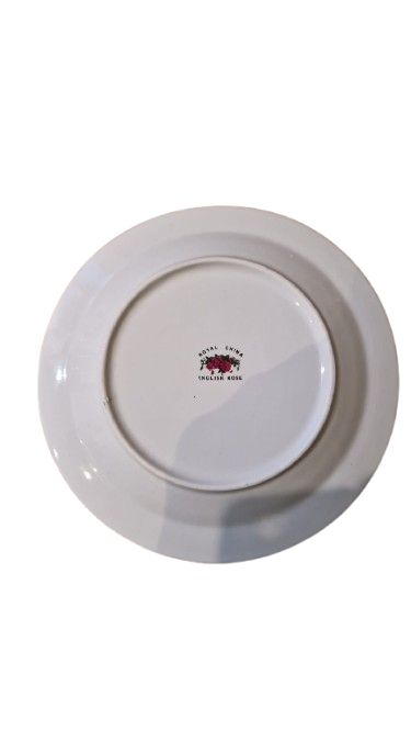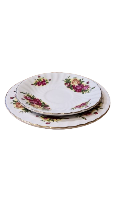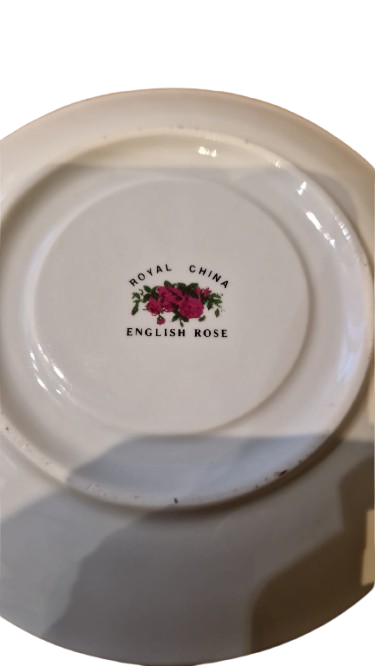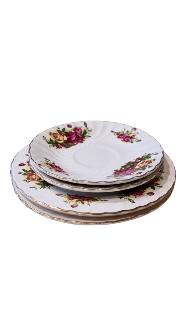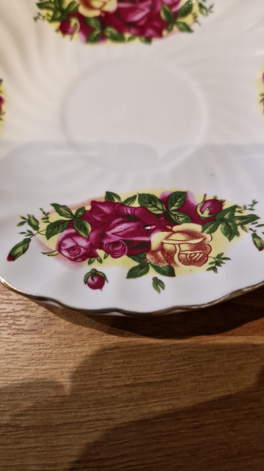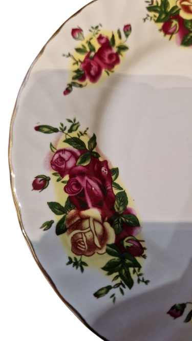 Sada čtyř porcelánových talířků s dekorem růží se vzorem "English Rose" s jemným zlacením po obvodu a vroubkováním.