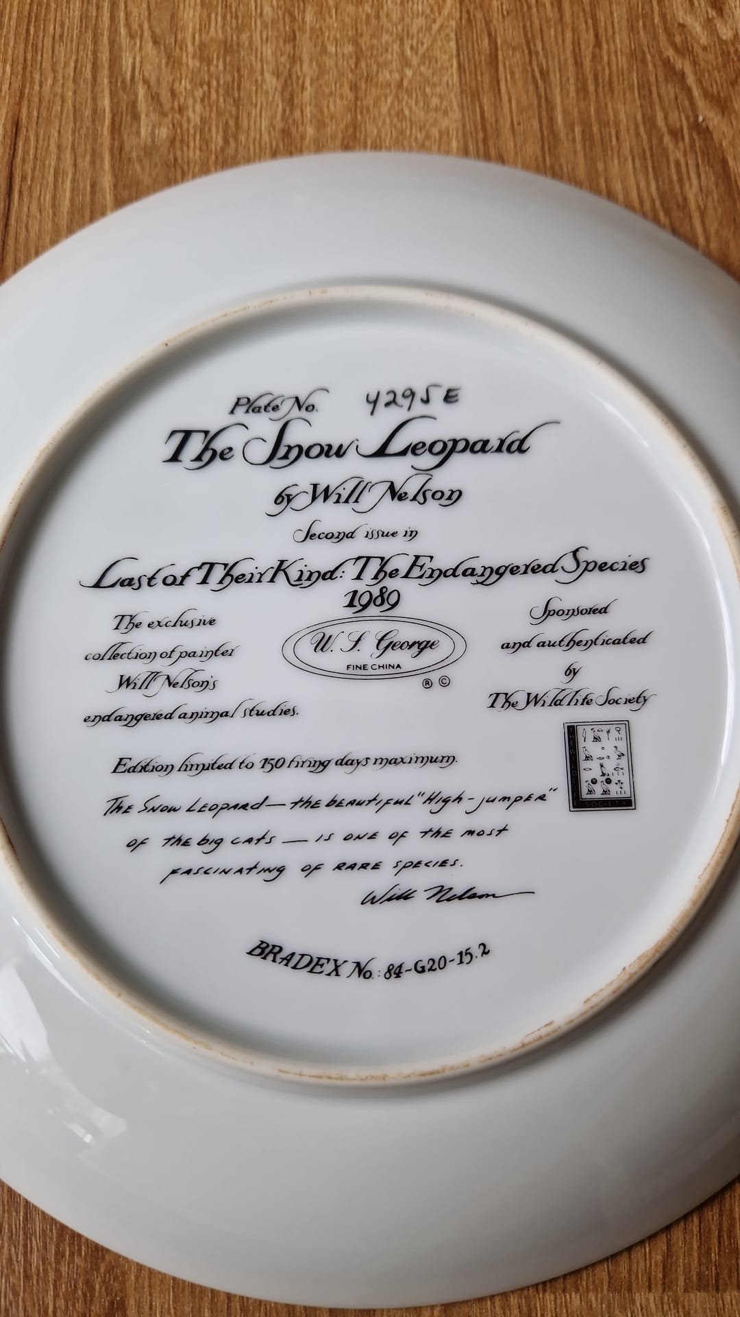 Talíř je z druhé emise v prestižní sérii "Last of Their kind: The Endangered Species" (Poslední svého druhu: Ohrožené druhy),vydaný v roce 1989. Vyroben byl pod záštitou W. S. George Fine China v oficiální spolupráci s The Wildlife Society.