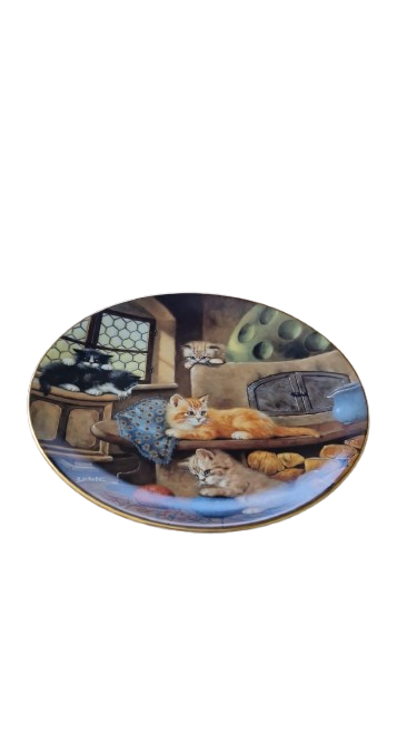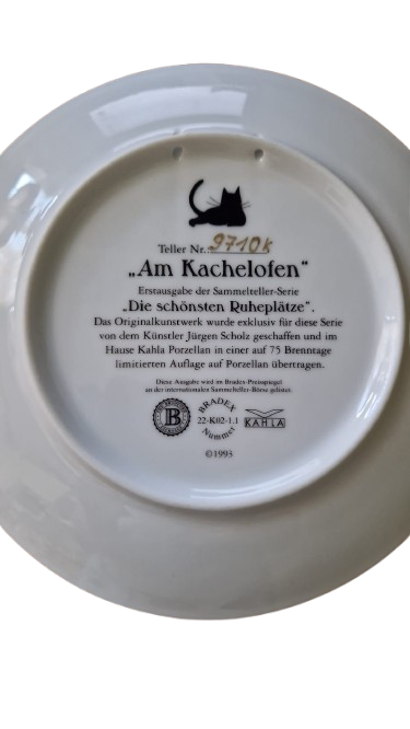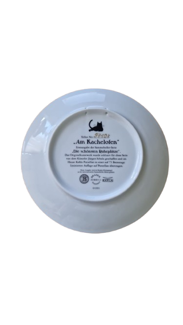 Sběratelský porcelánový talíř s názvem "Am Kachelofen" (U kachlových kamen), kter je součástí série "Die schönsten Ruheplätze" (Nejkrásnější místa k odpočinku).